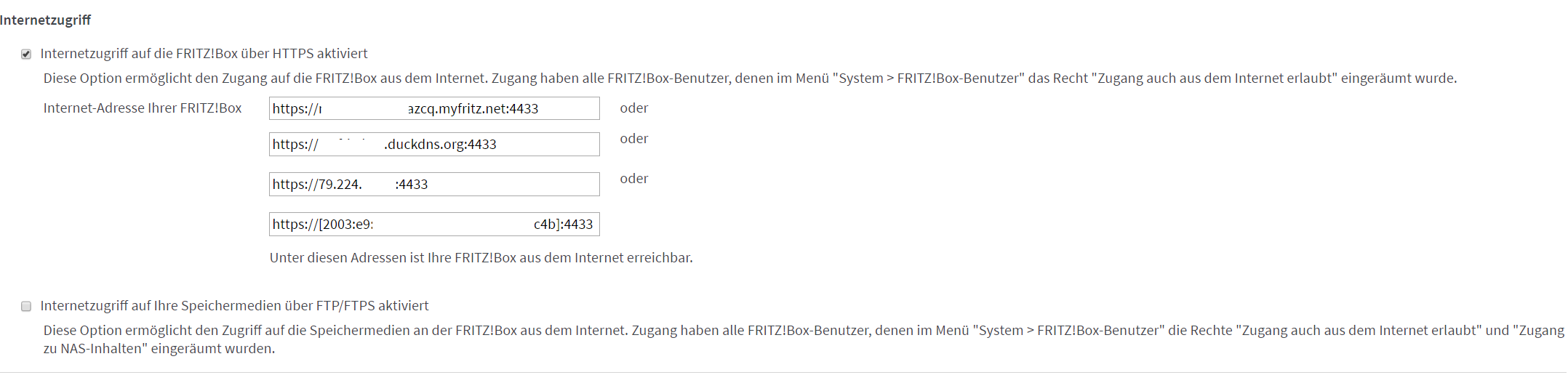 In der Weboberfläche der Fritzbox wurde mir jedoch eine IPv4-Adresse angezeigt. Nachdem sämtliche Zugriffsversuche auf den FTP gescheitert waren (Telnet ebenfalls erfolglos), habe ich testweise den externen Zugriff über HTTPS auf meine Fritzbox eingestellt. Auch dies hat nichts gebracht - ich kam weder über die von der Fritzbox angezeigte IPv4, noch über die IPv6 von extern auf die Weboberfläche.