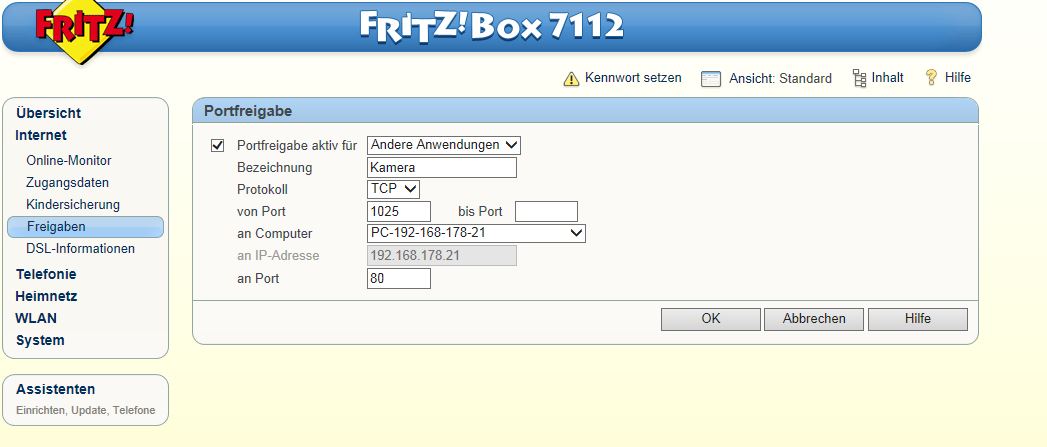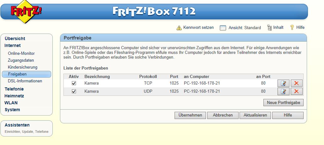 Außerdem kenne ich micht nicht mit mit den Portfreigaben aus. Habe zwar ein bisschen rumprobiert, aber irgendwas stimmt wohl nicht. Ich habe ein paar Screenshots von Fritz.Box und Co angehängt. Viell. kann mir ja hier jemand helfen?