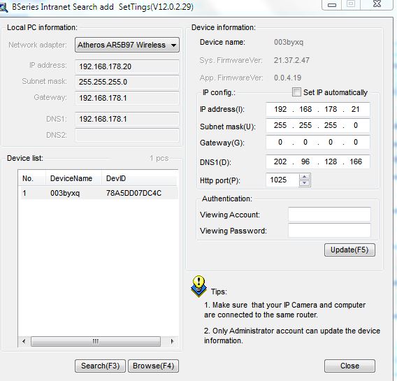 Ich habe mir bei Ebay eine Kamera gekauft (DB Power irgendwas) und LAN und WLAN funktioniert schon mal soweit.