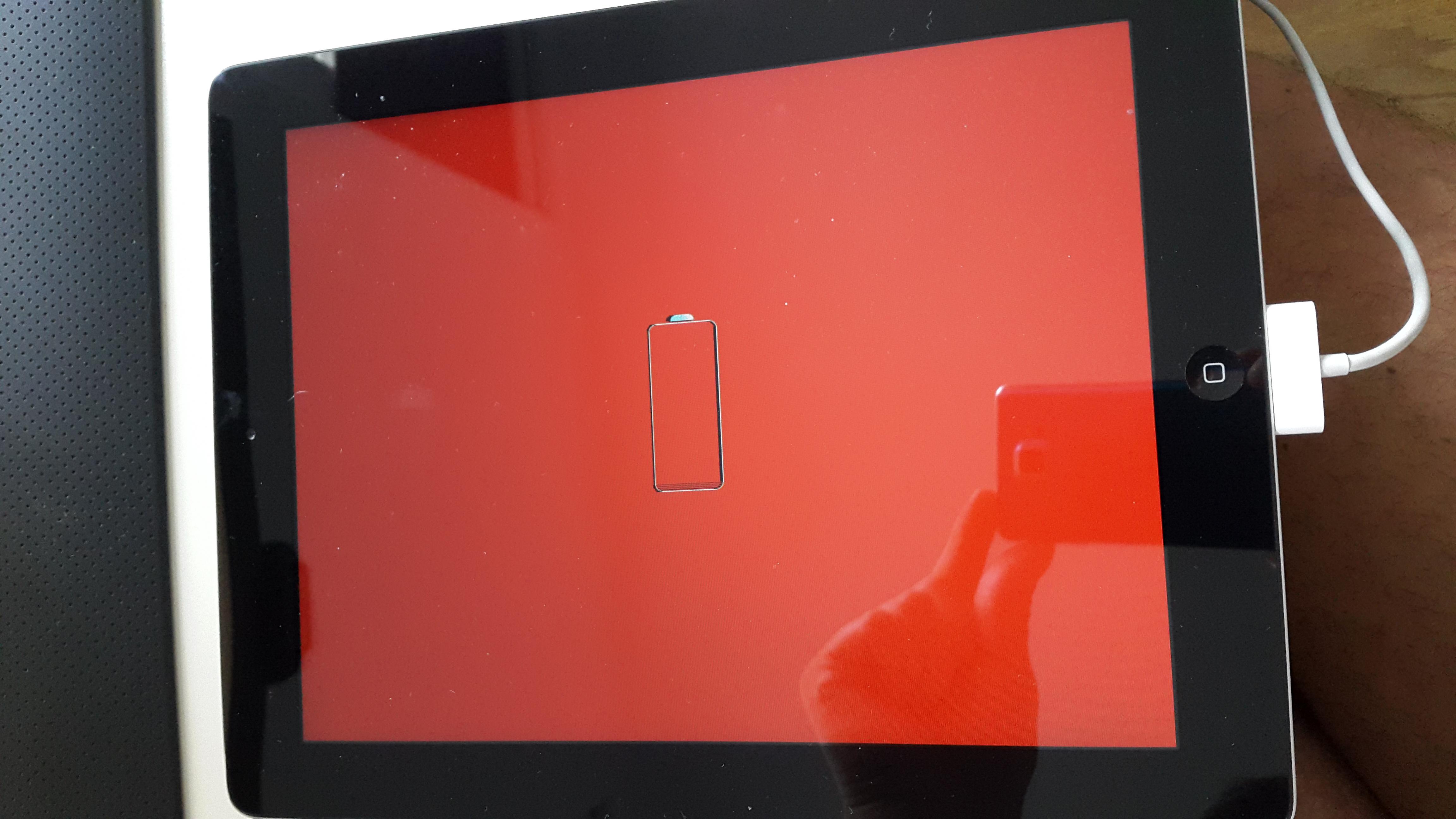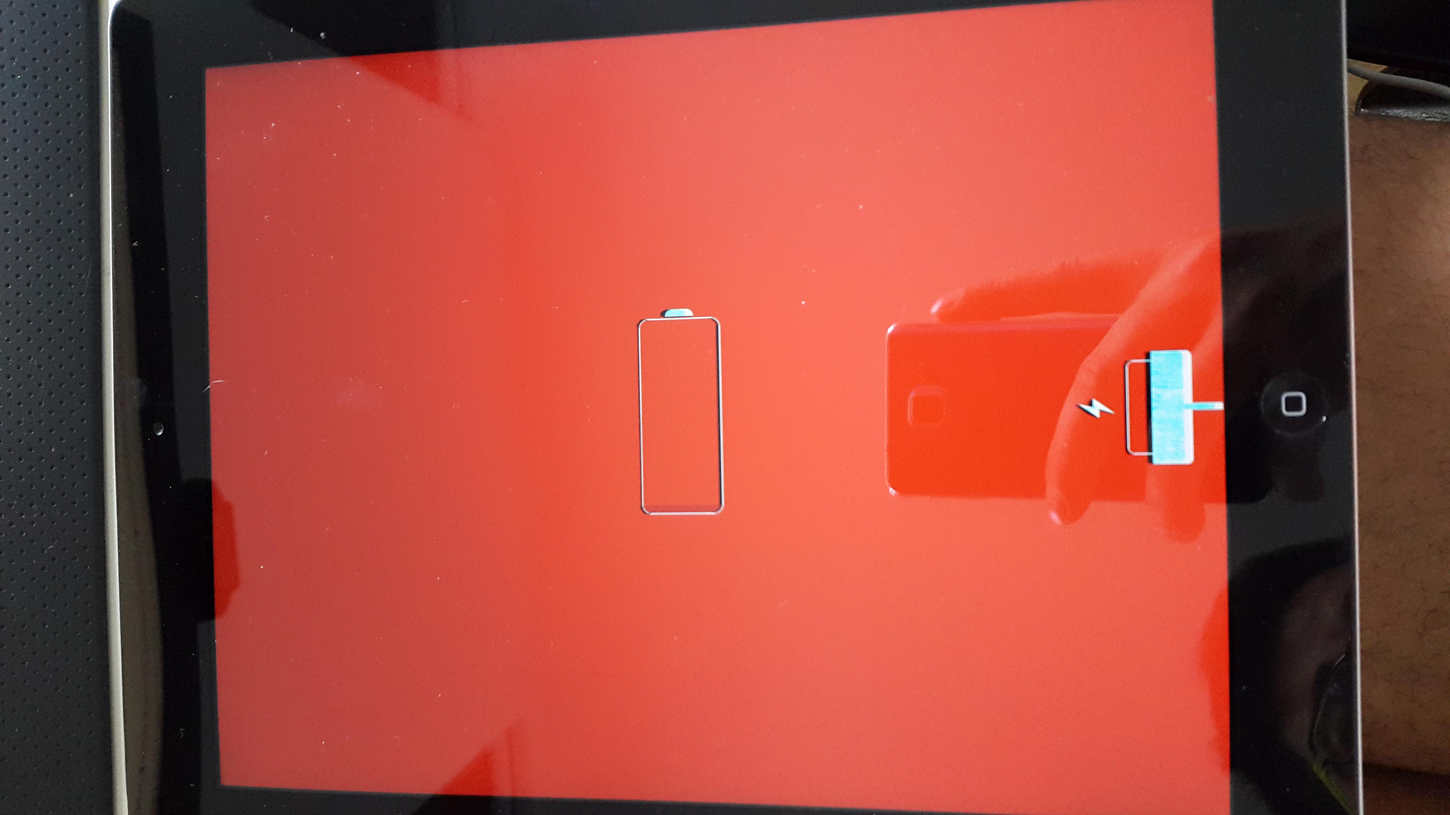 Der Bildschirm ist rot und zeigt eine weiße Batterie sowie das Symbol für den Stromstecker. Wenn ich das iPad an Strom anschließe, verschwindet letzteres.