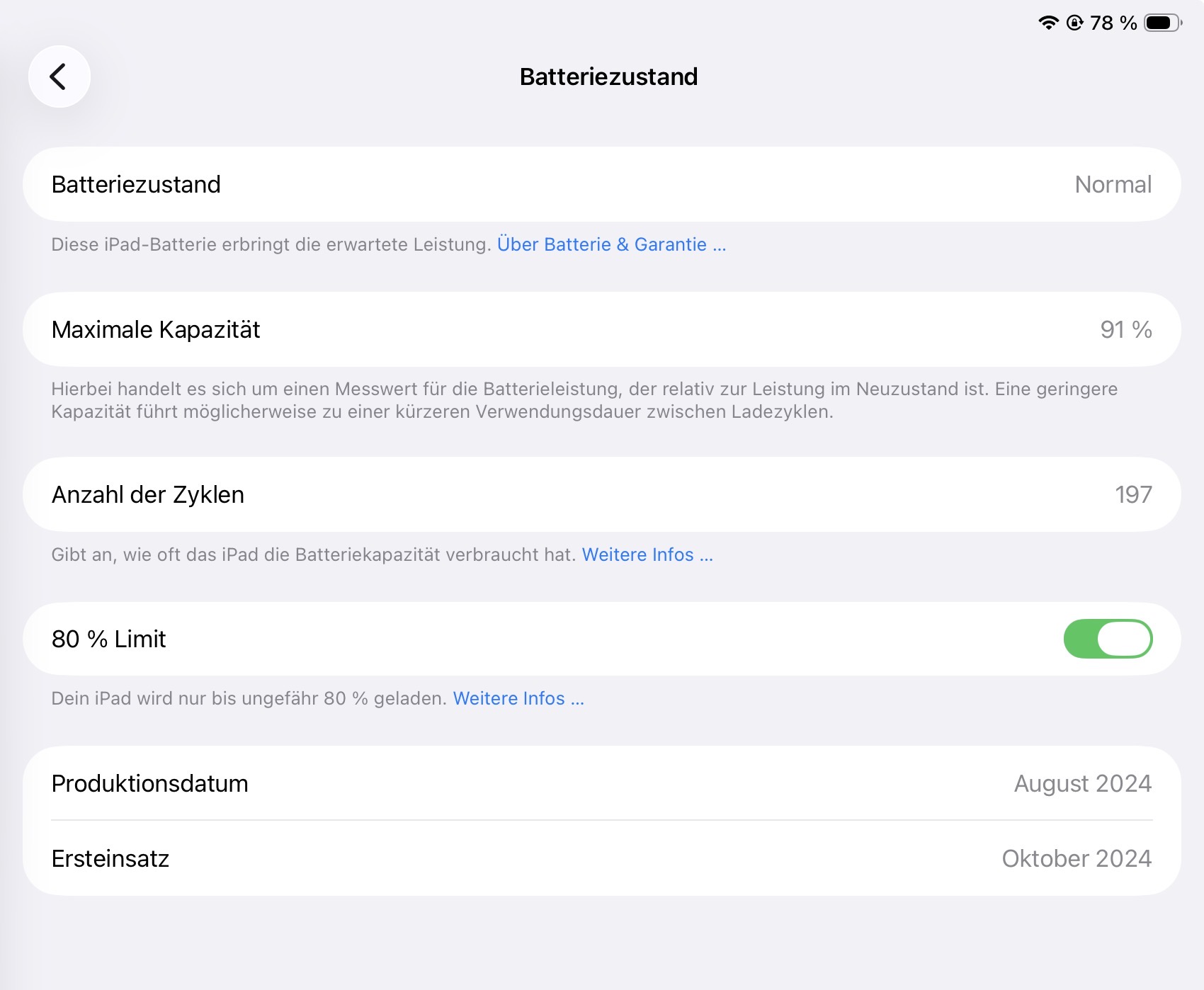 Laut Apple soll unter Optimalbedingungen erst nach 1000 Ladezyklen etwa 80% erreicht sein, bei mir sind aber gerade 197 Ladezyklen passiert.