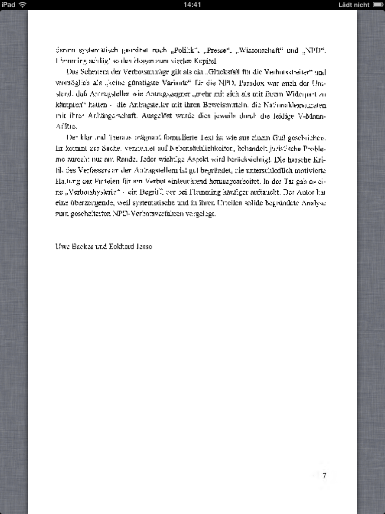 Heute ist mein iPad2 angekommen, das ich hauptsächlich dazu gekauft habe, um von mir selbst erstellte PDFs darauf zu lesen. Leider ist das Ergebnis äußerst unbefriedigend. Mir ist es zwar gelungen, ein paar PDFs auf das iPad zu laden (via Dropbox) und in iBooks zu importieren. Aber die PDF sind nur äußerst schwer lesbar. Irgendwie erscheint mir die Schrift immer unterbrochen. Da ich das schwer erklären kann, habe ich einfach mal ein Bildschrimfoto gemacht, um Euch das Problem zu zeigen.