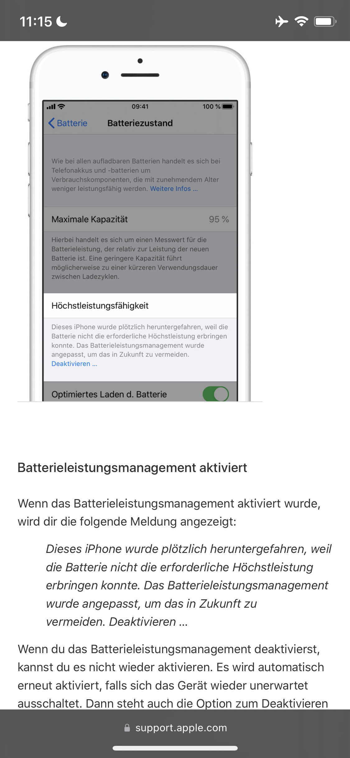 Und das deine Möhre mit 87% noch so funktioniert wie am ersten Tag glaubst du doch selber nicht oder? Bei meinem XS Max habe ich auch mit 86-87% den Akku tauschen lassen nach 3 Jahren. Das ist ein komplett anderes Telefon geworden durch den Akkutusch. Das habe ich dann meiner Mutter übereignet. Meinem Vater habe ich hier im Forum ein gebrauchtes XS gekauft. Mit irgendwas um die 83% Akku. Unbenutzbar. Akku tauschen lassen. Läuft wieder Top mit Laufzeiten von mehreren Tagen, bei zugegeben geringer Nutzung.