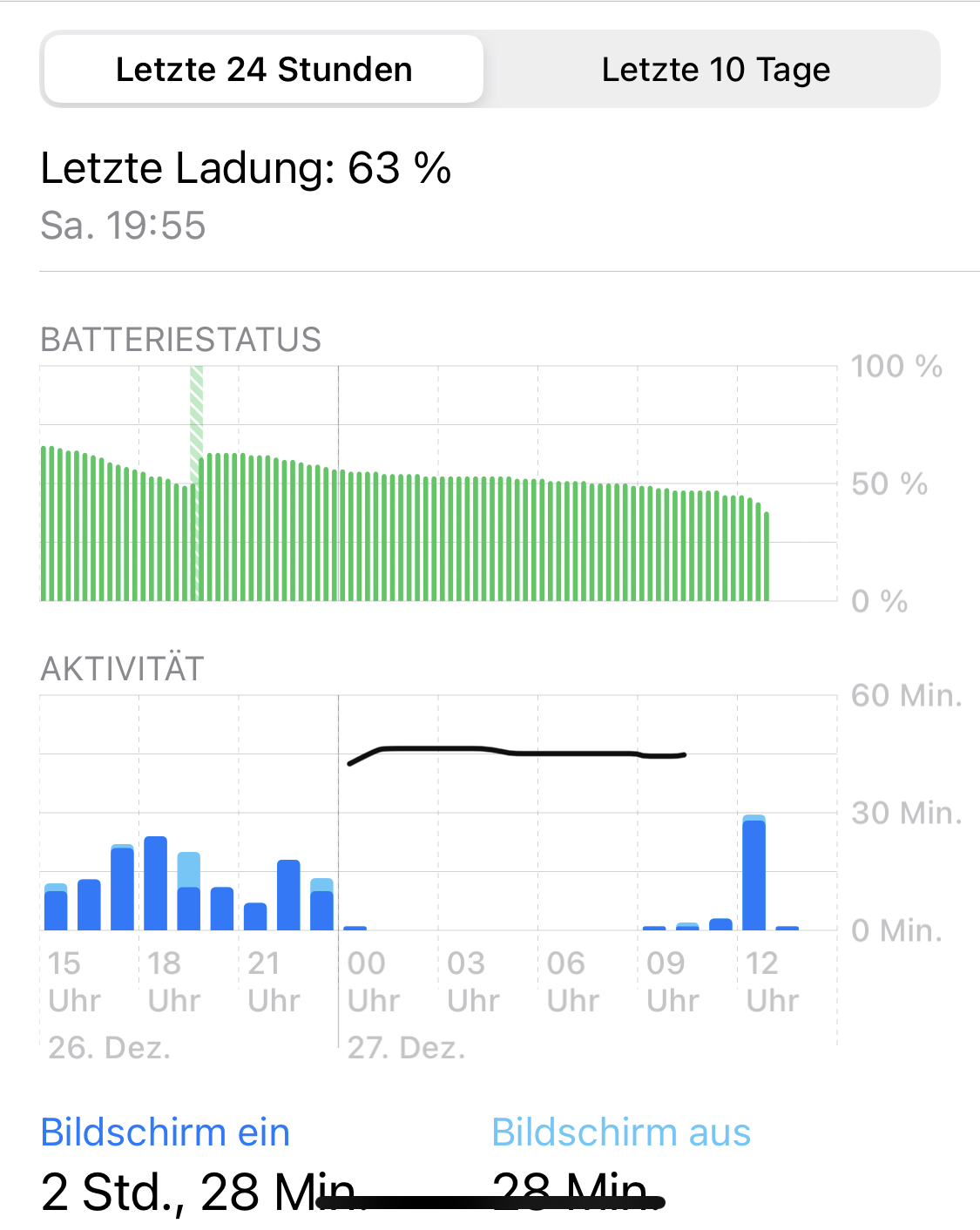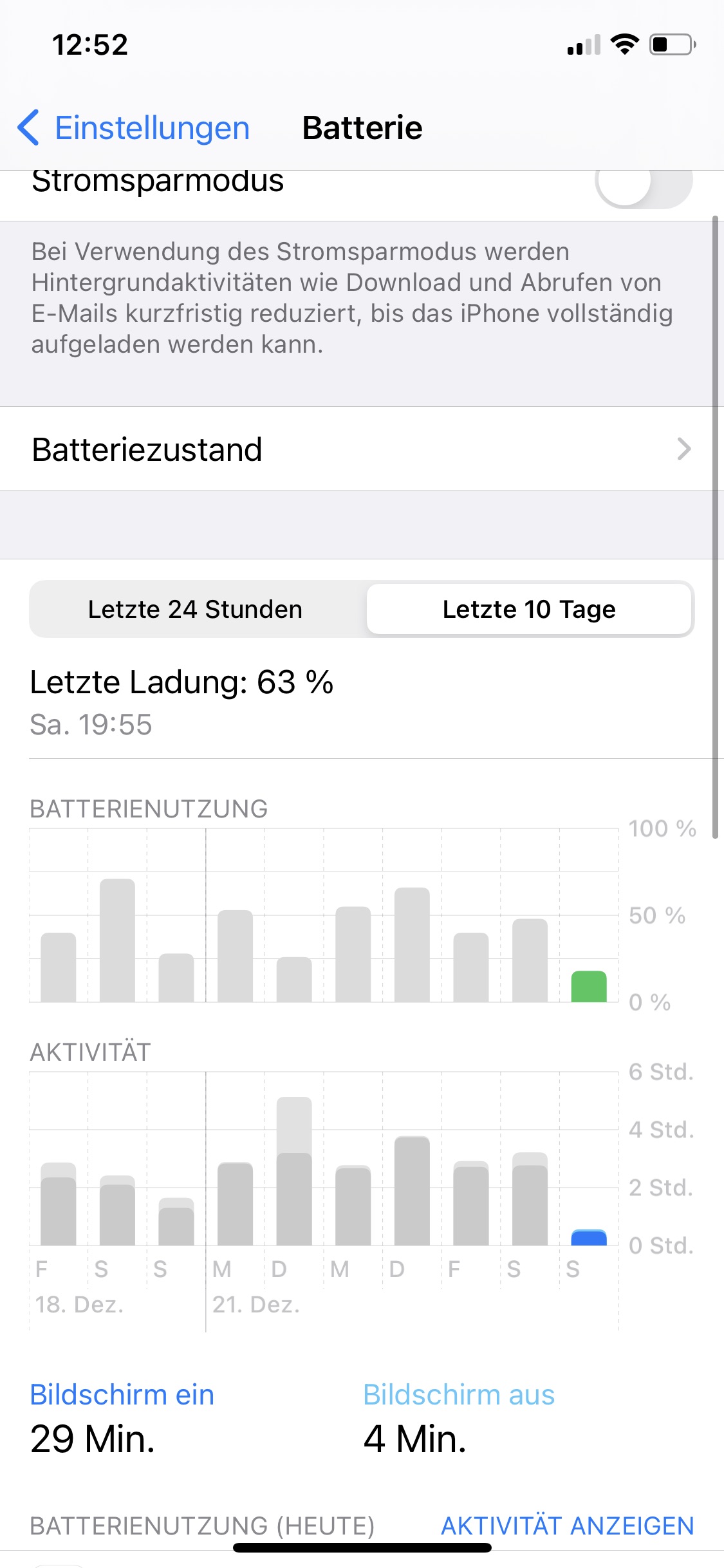 Jetzt habe ich mit täglich ca. 30 Minuten Safari, 10-15 WhatsApp und ca. 10 Minuten Telefon noch 68% Akku.