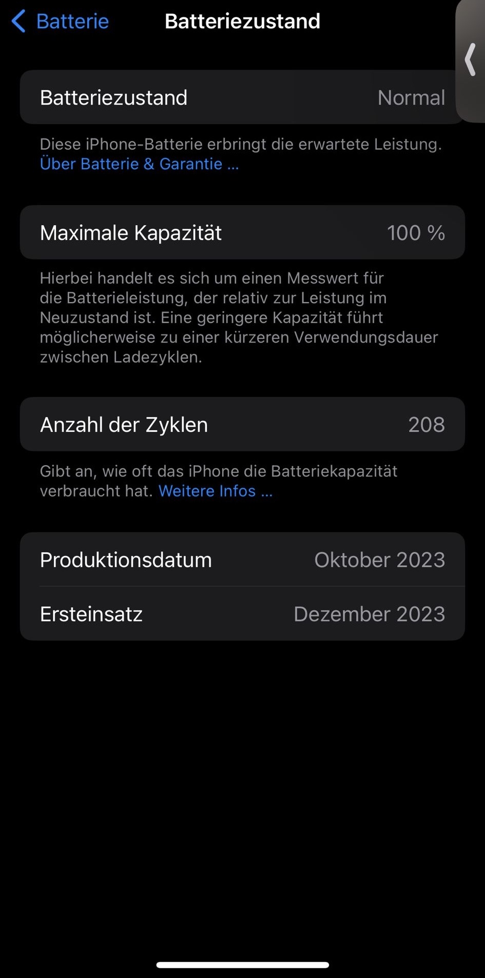 Ich finde das echt erstaunlich! Mein 15 Pro Max ist nur einen Monat älter als Deins und mein Akku steht bei 89%. Ohne induktives laden, ohne schnellem Laden... wie kann sowas sein!?
