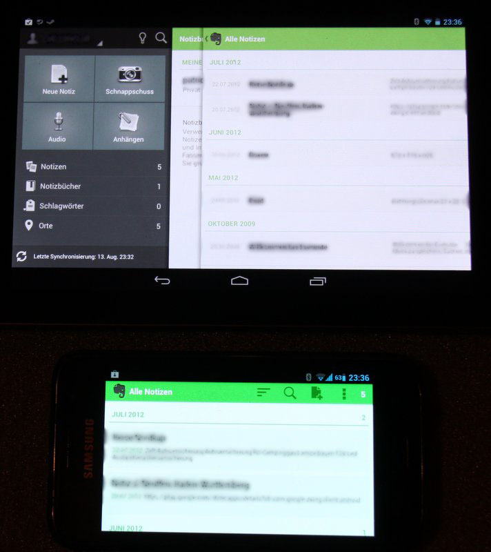 Das erste Beispiel ist Evernote, welches auf dem Tablet schon Menüleisten anzeigt, für die man sonst das Bild zur Seite schieben müsste. Außerdem sieht man mehr von einem Bereich den man sonst scrollen müsste.