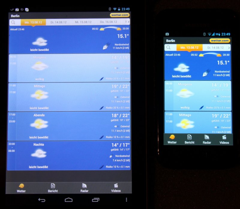 Das 3. Beispiel, Wetter.com, ist eine von den angesprochenen Apps die sich eigentlich rein dadurch skalieren da sie auf scrollen basieren und man dann eben entsprechend mehr sieht, bei der es aber keine Tablet Optimierung in diesem Sinne gibt. Schlecht sieht es aber trotzdem nicht aus.