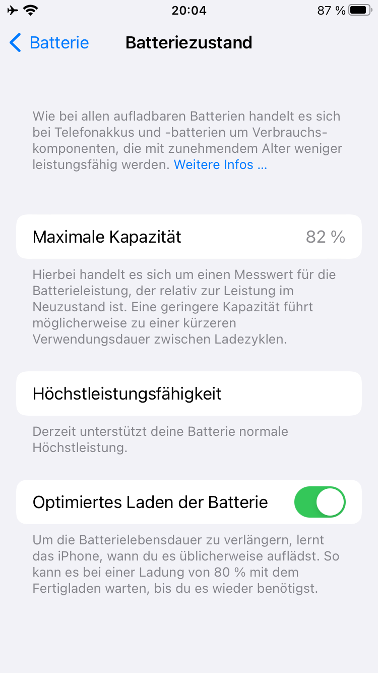 ich habe hier ein iPhone 6S dass von der Absturzproblematik bei niedrigen Akkuladestand betroffen ist. Laut Einstellungen hat der Akku aber noch 82% Kapazität. Trotzdem scheint er ja nicht ganz okay zu seien.