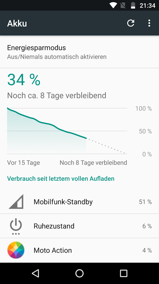 Die Akkulaufzeiten beim iPhone sind zwar nicht die allerbesten, betrachtet man im Vergleich die Akkukapazität, fällt schon auf, dass iPhones mit vergleichsweise geringer Kapazität doch recht lange laufen. Dass die Standby-Zeit beim iPhone auffällig hoch ist, kann ich allerdings nicht nachvollziehen. Siehe Screenshot eines Moto G4 im Standby. Von einem Telekom Puls (Tablet) kenne ich immerhin zwei Wochen.getexact schrieb:Standby Zeit beim iPhone ist dazu noch um einiges besser als bei allen anderen.