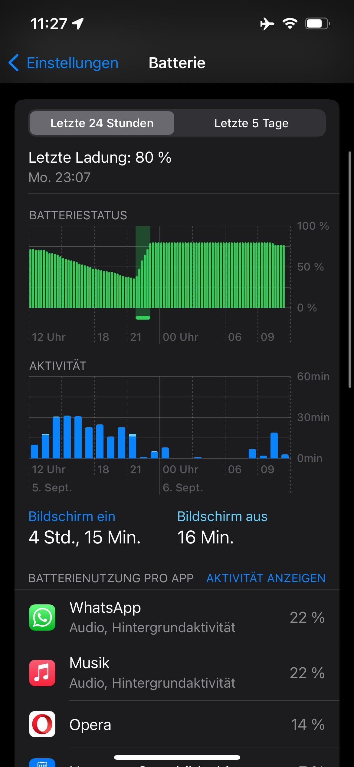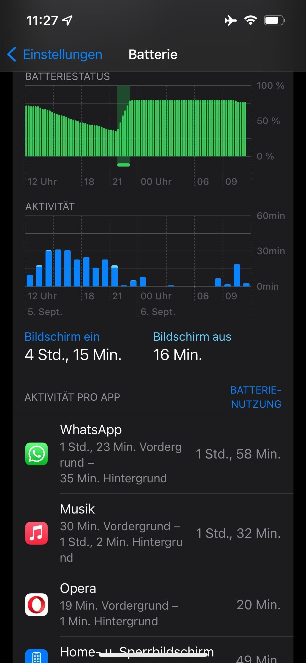 anders ausgedrückt gönnt sich Whatsapp 11% pro Stunde, Opera hingegen 42%.