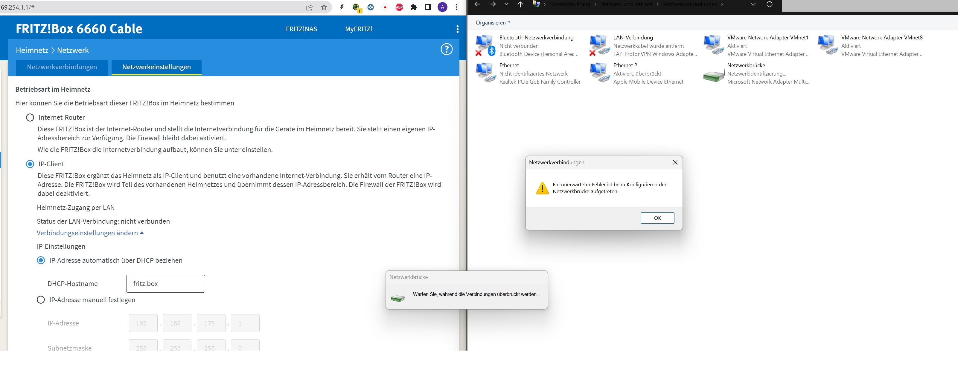 Edit: Hab noch in Erinnerung, dass man die Ethernet Verbindung als Brücke einrichten kann und die Fritzbox als Client konfigurieren muss. Leider verändert Windows alle paar Monate die Einstellung, dass ich da nicht mehr weiter komme.