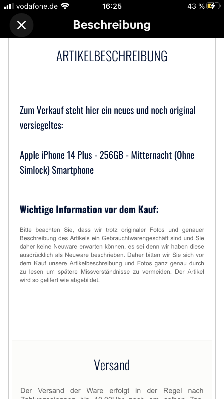 Ich würde mich ja fragen, wer ein neues versiegeltes iPhone 14 Plus dann für 950 Euro verkauft.
