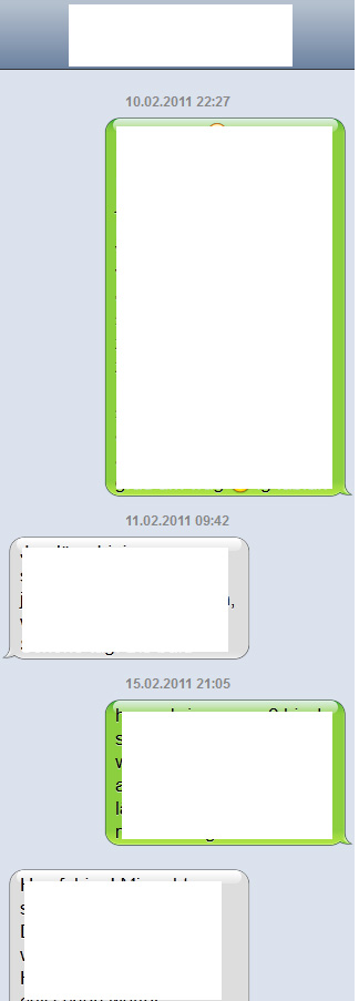 Vielleicht kennt ihr das Tool iTwin, damit kann man unter anderem SMS Verläufe vom iPhone exportieren. Genau das habe ich gemacht, nun habe ich einen SMS Verlauf als HTML Datei inklusive Sprechblasen (siehe Grafik).