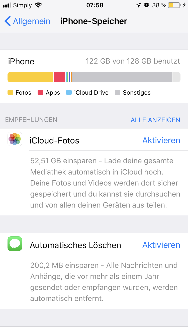 Ich würde jetzt ungern das Telefon komplett resetten. Habt ihr noch eine Idee woran das liegen könnte? Das der Speicher zu 1/3 bzw. knapp der Hälfte voll war das kommt auch in etwa hin. Nur dieser "Sonstiges" Balken ist jetzt irgendwie komplett voll.