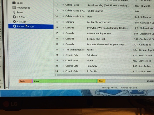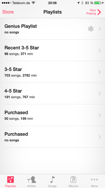 Siehe auch Fotos - es handelt sich um die Playlist Recent 3-5 Star. Sollten 98 Elemente sein - so zeigt iTunes das auch an und witzigerweise habe ich es abfotografiert nicht aus meiner Musik Library sondern aus dem iPhone Tab in iTunes (also Musik die sich auf dem Gerät befindet).