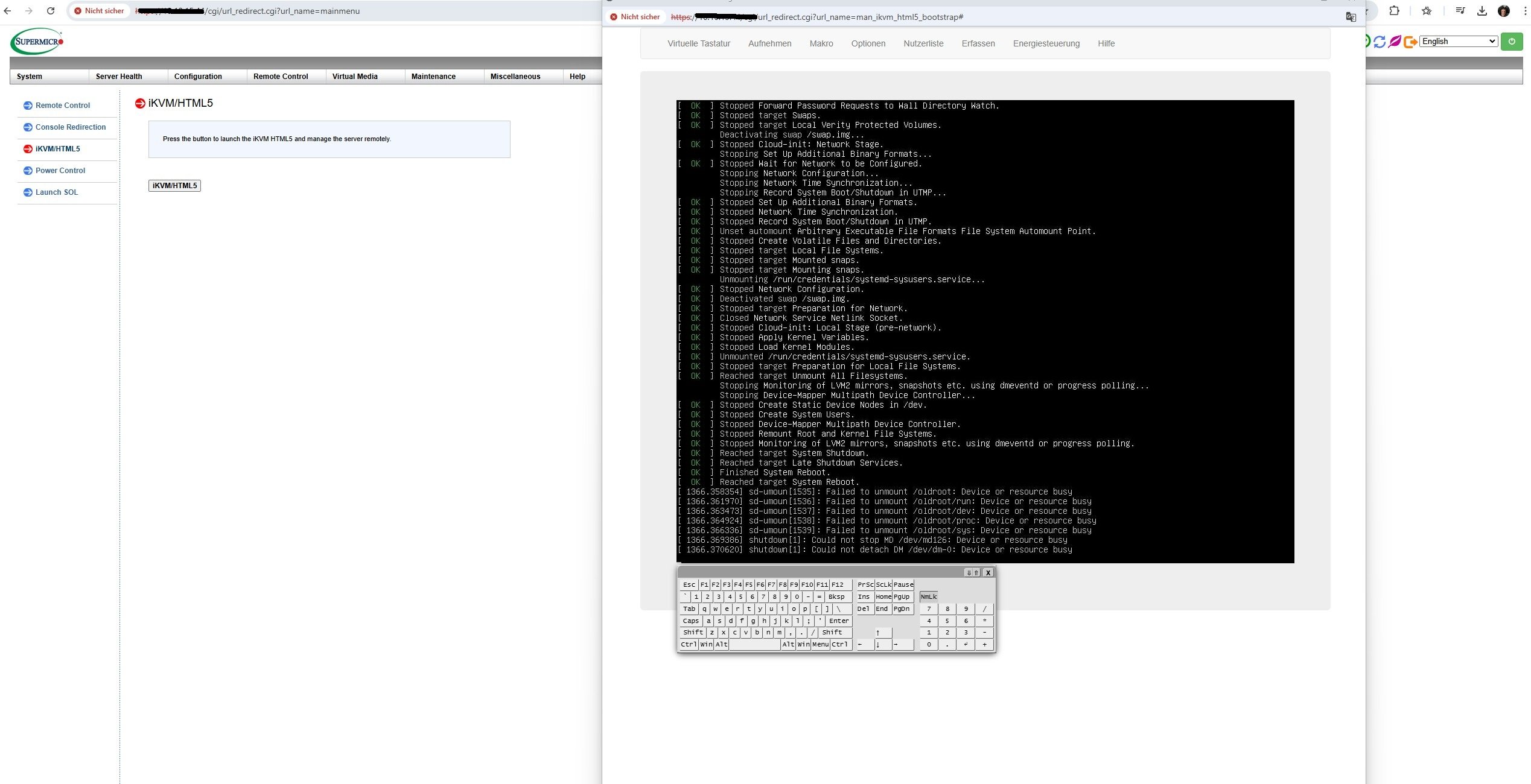 Ich habe seit heute einen Rootserver der über IPMI läuft, laut der Anleitung vom Anbieter brauch ich die Iso im Interface nur zu mounten und den Server Neustarten und dabei F11. Aber das funktioniert nicht weil mit dem Neustart die Verbindung abbricht ich muss dann die VPN Verbindung trennen und neu aufbauen aber der Server ist dann schon längt wieder auf der HDD gebootet.