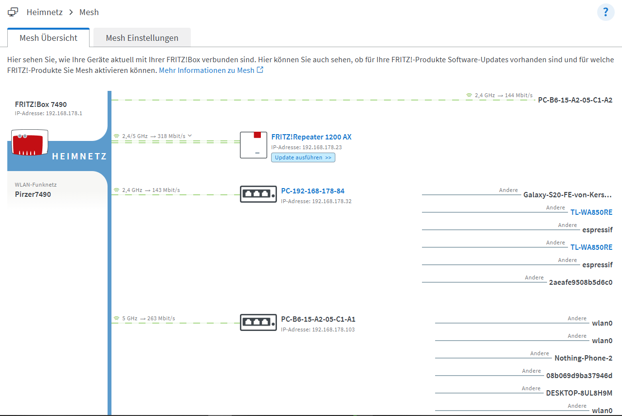 aber nur weil ich mich mit dem wlan router verbunden habe der mit unserem eigentlichen router per lan verbunden ist. das is alles sehr komisch. wenn ich mich mit dem router verbinde geht alles aufeinmal. aber bei dem router mit dem der router verbunden ist bei dem alles geht, geht gar nix. Also um das einfacher verständlich zu machen wir haben einen fritzbox router der mit dem anschluss im keller verbunden ist, der heißt Pirzer7490. dann einen router eine etage weiter oben, der heimnetz heißt der mit dem router pirzer per lan verbunden ist, bei dem alles geht wenn ich mich per wlan mit dem verbinde. und dann noch verstärker im ganzen haus. der in meinem zimmer ist mit dem router pirzer verbunden und macht quasi nochmal ein eigenes wlan das Patrick heißt. Der Patrick Router hat einen lan anschluss der mit meinem pc verbunden ist. heißt bei pirzer und patrick geht "nix"