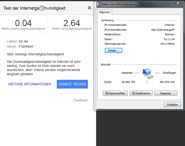 Heute habe ich als ersten Erfolg festgestellt, dass IPv6 keinen Internezugriff hat. Nach einiger (stundenlanger) Recherche habe ich herausgefunden, dass diese "Einstellung" zu einer Verlangsamung der Geschwindigkeit führen kann, so wie ich sie feststelle.