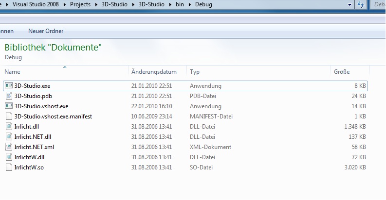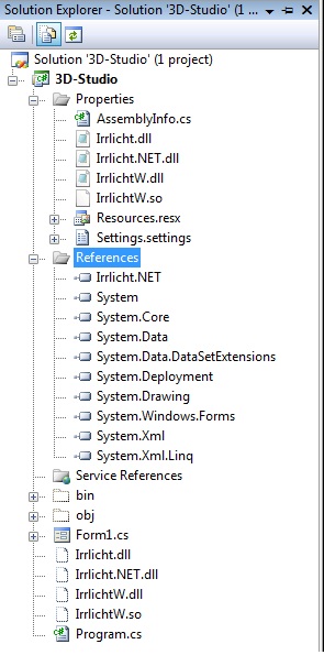 Jetzt hab ich die Irrlicht.Net.dll aus diesem Ordner als Referenz zu meinem Projekt hinzugefügt und dann die Irrlicht.dll, IrrlichtW.dll und Irrlicht.so zum bin-Verzeichnis, also neben mein Projekt kopiert.