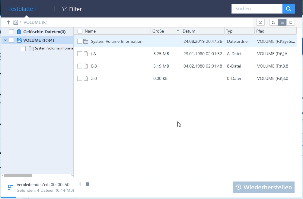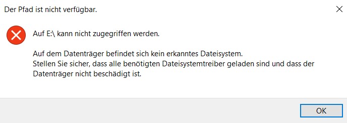 Auf dem Datenträger befindet sich kein erkanntes Dateisystem. Stellen Sie sicher, dass alle benötigten Dateisystemträger geladen sind und dass der Datenträger nicht beschädigt ist.