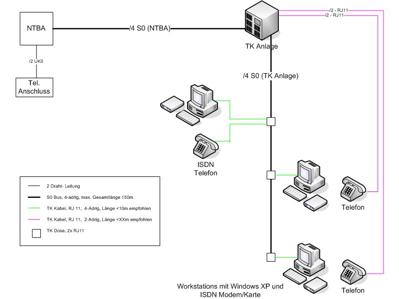 Die TK Anlage ist mit dem S0 bus des NTBA verkabelt (max 150m länge)