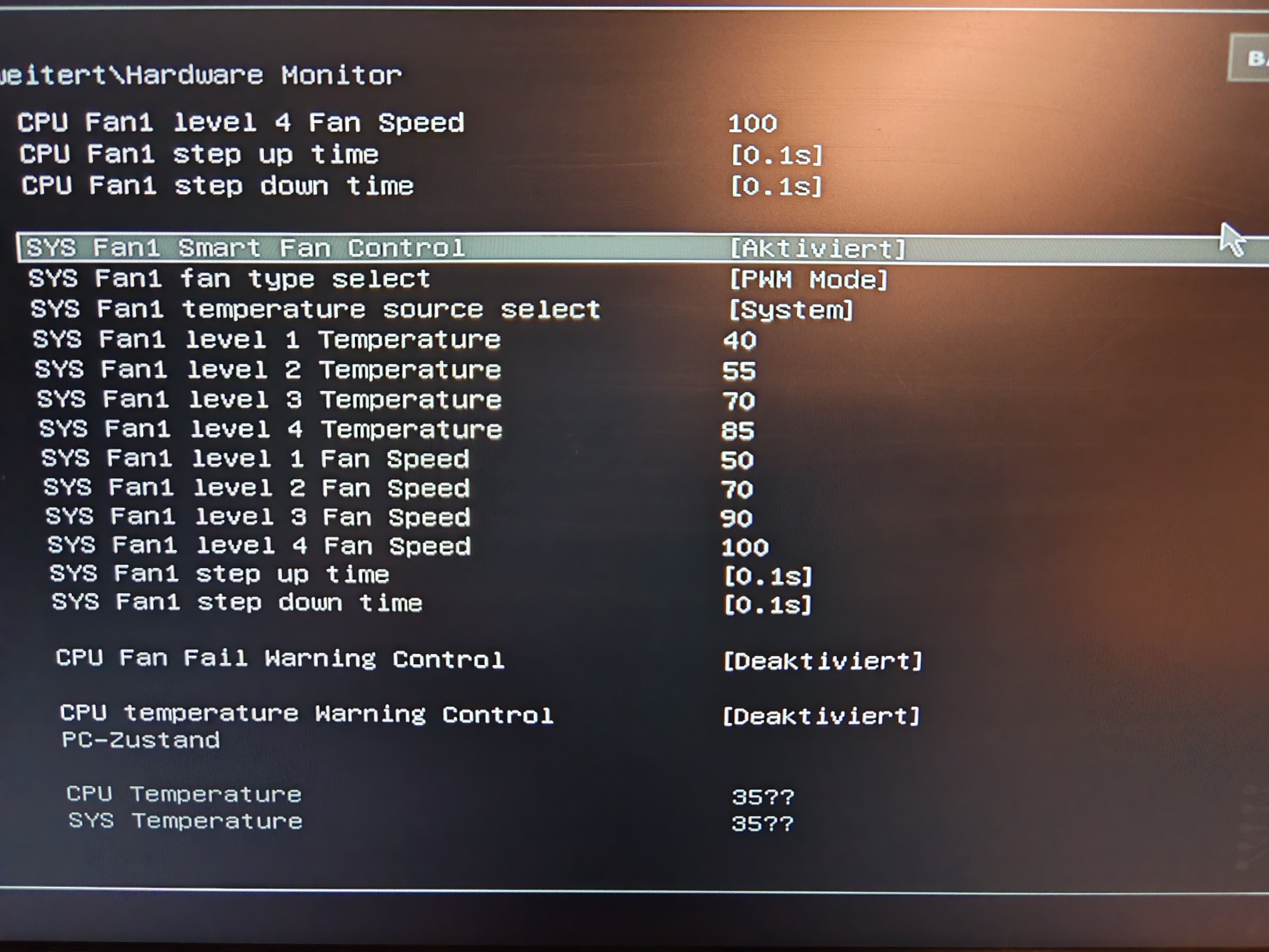 Liegt es einfach am Board? Oder mache ich etwas in den Einstellungen falsch? Die Werte im Bios lassen sich nicht ändern. Ich kann nur Aktiviert oder Deaktiviert wählen, egal was ich wähle es ändert nichts an der Lautstärke. Temperatur source lässt sich auch nur auf CPU oder System einstellen.