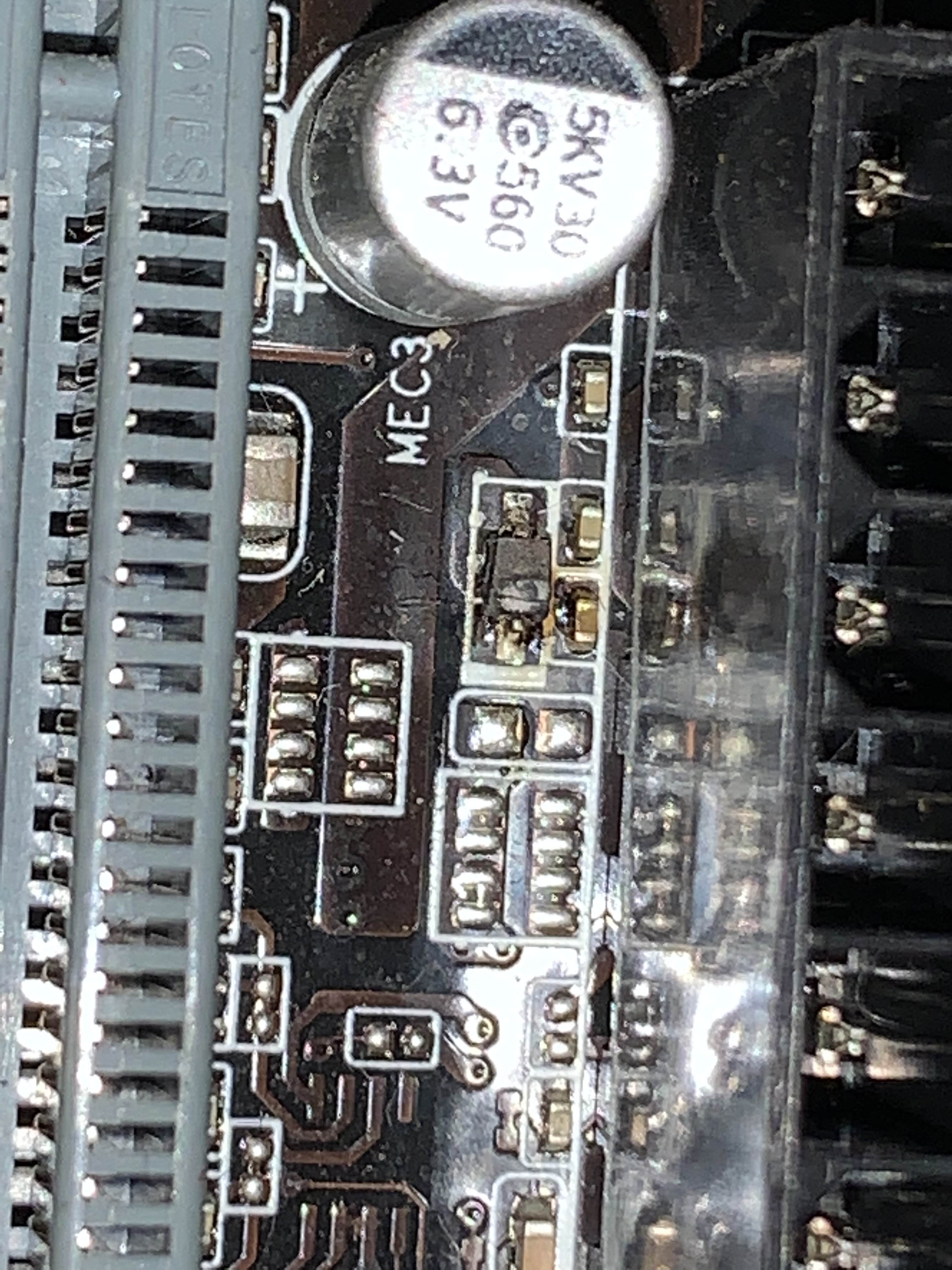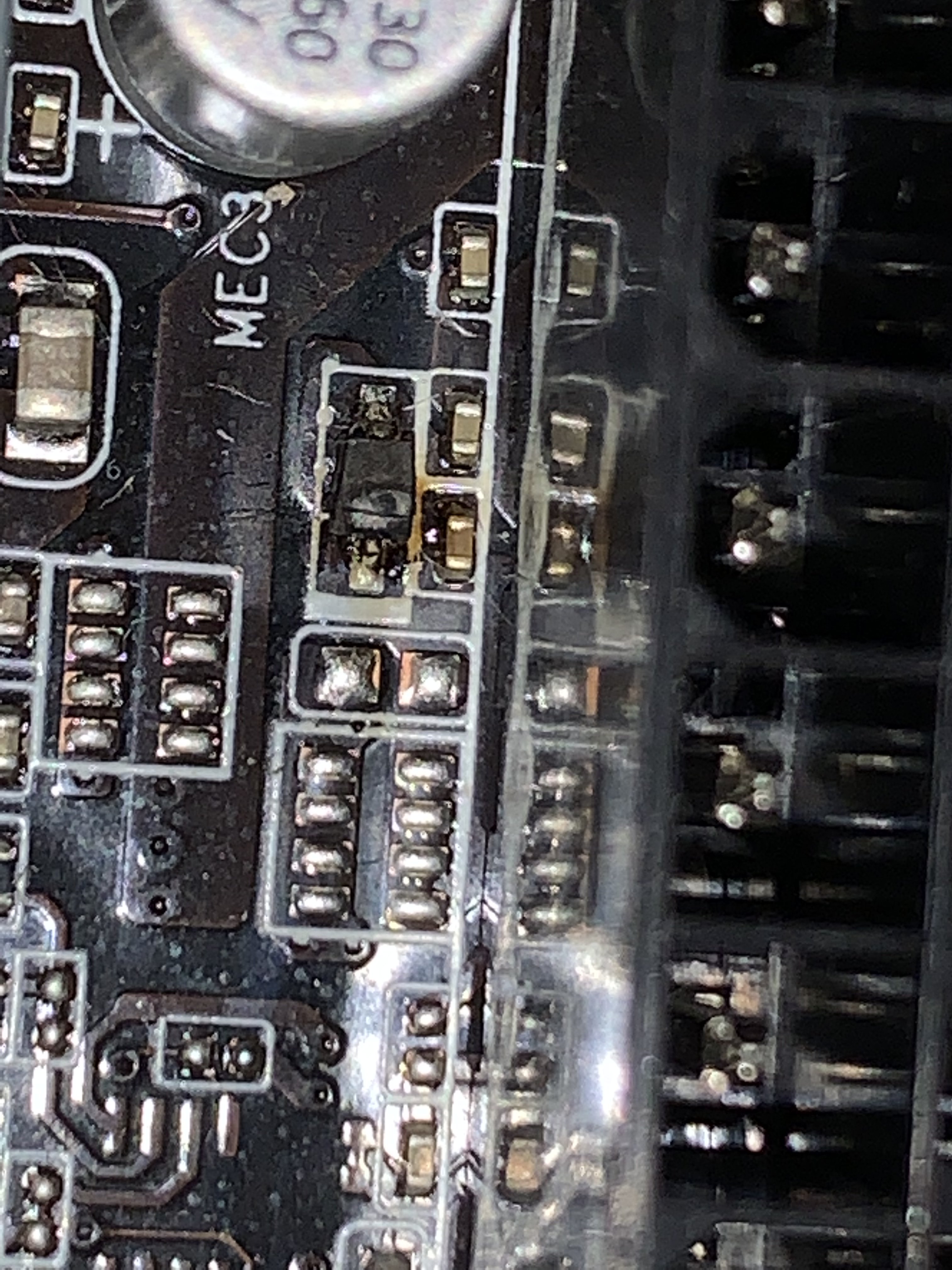 Im Bild zu entnehmen ist dort direkt hinter der Hauptstromversorgung neben den ATX Port ein kleines Bauteil auf eine Grillparty gegangen… und das dieses Teil direkt hinter dem großen ATX Stecker sitzt vermute ich mal das es eine sehr wichtiges Bauteil für das Spannungsmanagement ist. :/
