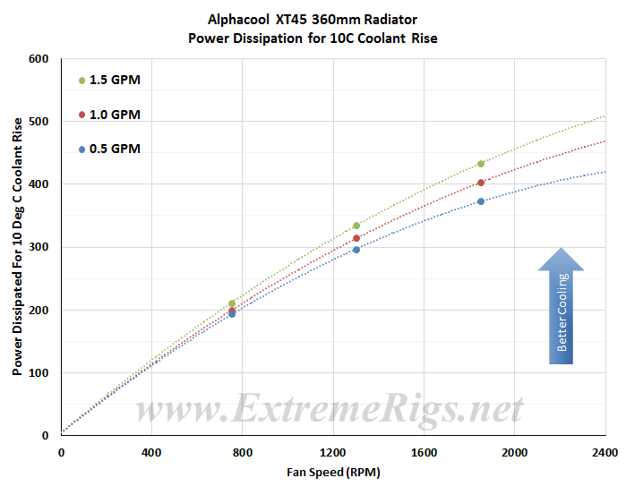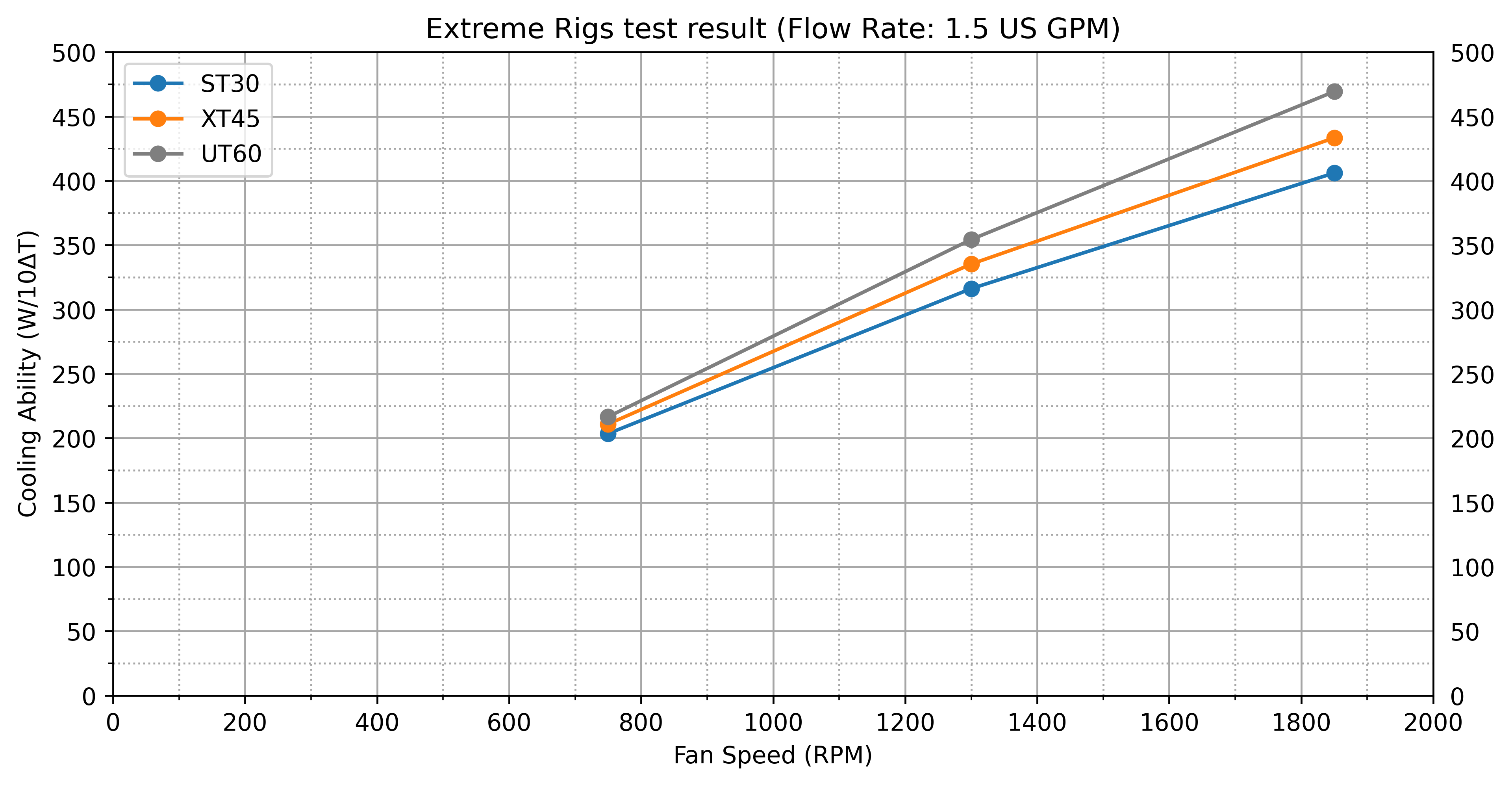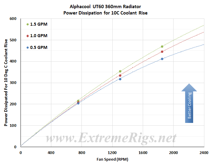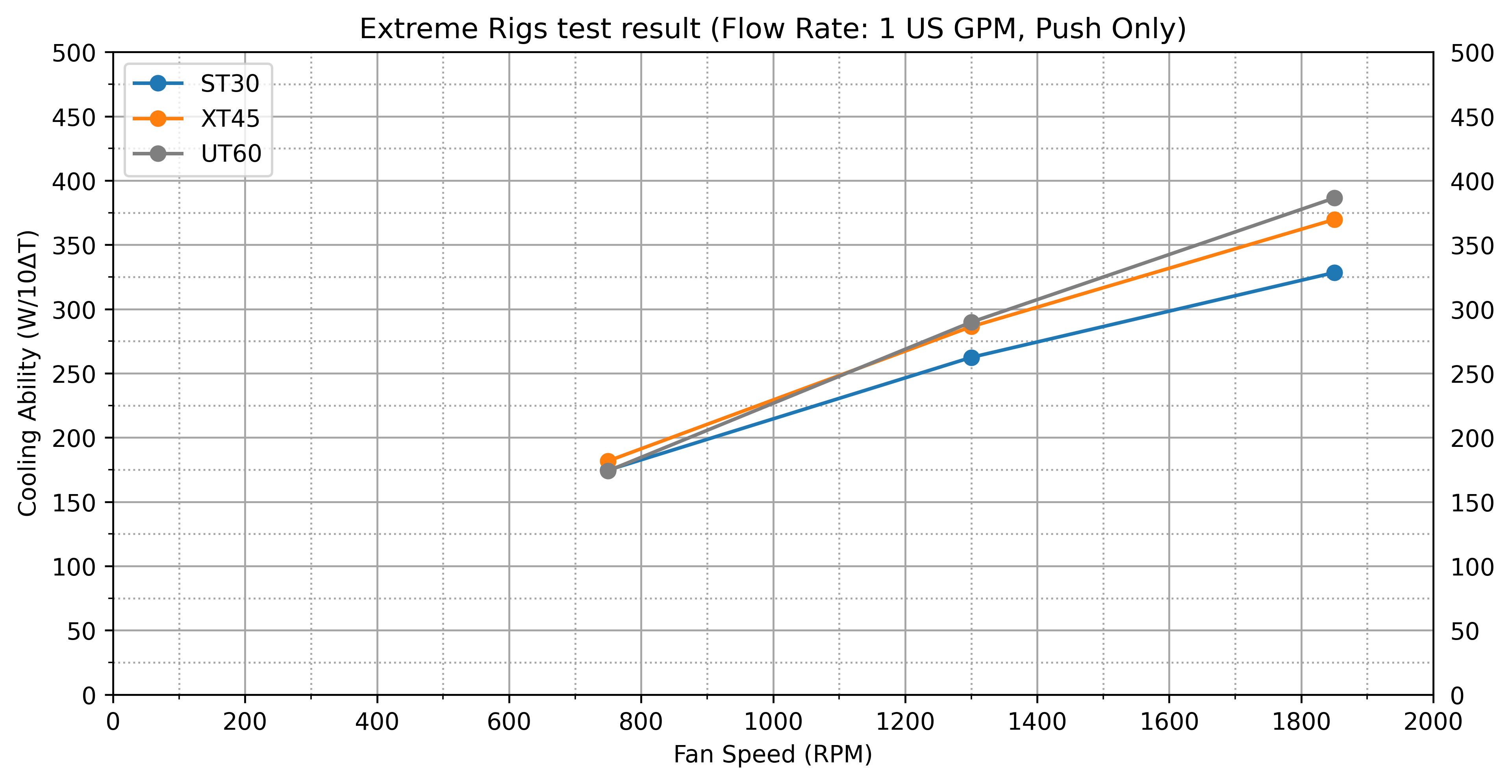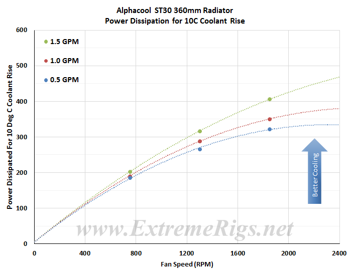Die Spreizung der abgeführten Watt, zwischen 0,5 und 1,5GPM, ist bei schnellen Lüftern und 30mm Radiator größer als bei dem 60mm Radiator.