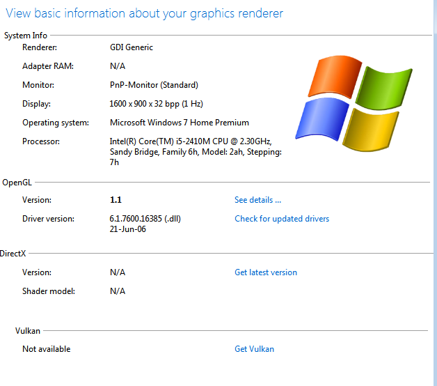 Jetzt wollte ich schauen, ob die Graffikarte was hat, da ich mich nicht damit auskenne, was noch kaputt sein könnte. Denn das Meiste läuft auf Win7 auf dem Laptop jetzt, aber nicht alles. Gefühlt laufen (Youtube)-Videos nicht so flüssig wie gewohnt und Spiele scheinen gar nicht zu gehen. Anspruchslose Spiele, die ich vorher gespielt habe, gehen gar nicht mehr. Yu-Gi-oH Duel Links habe ich auf Win10 oft genug gespielt, jetzt starte ich das Spiel und es eigentlich nur ein einziger Dauerlag und ist nicht bespielbar. Bei Rocket League kriege ich die Nachricht "Your video card does not support alpha blending with floating point render targets (..), which is required to run this game. Exiting..." Also beides Spiele, die früher problemlos spielbar gewesen sind.