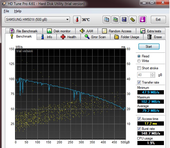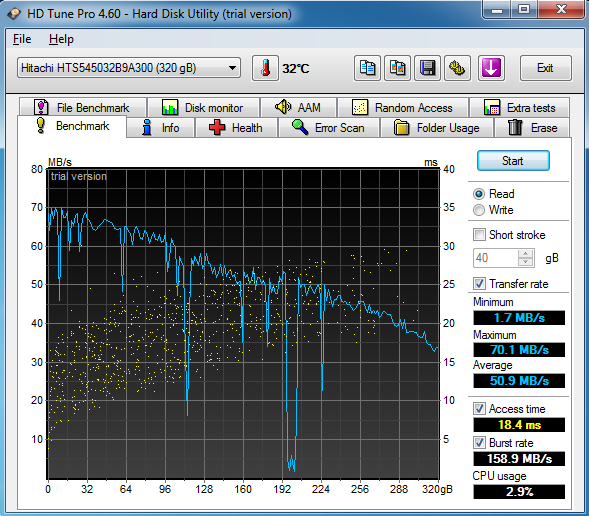 ich möchte eine größere Festplatte für mein Notebook Samsung R530 Nion. Es ist eine Hitachi HTS545032B9A300 320 GB 5400 rpm verbaut. Im Anhang mal ein Hdtune Test dieser Platte.