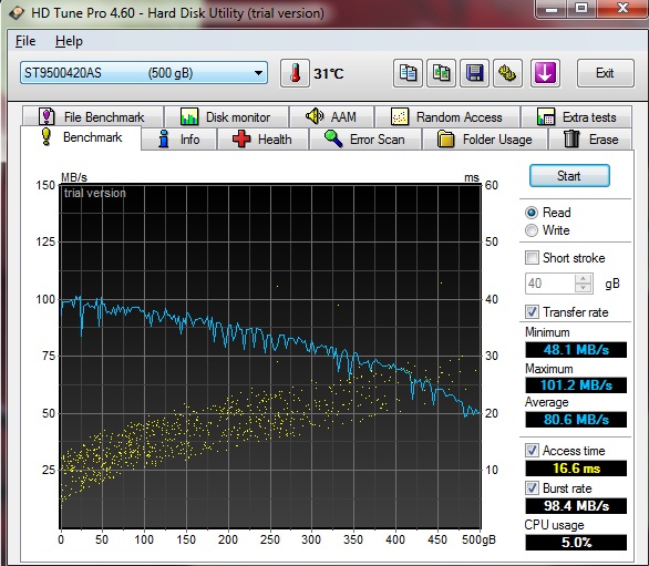 Nun möchte ich auf eine Seagate Momentus 7200.4 500 GB 300 MBps 7200 rpm aufrüsten. Diese Festplatte hat meine Freundin im HP G62-130eg verbaut. Diese ist fast unhörbar und schon deshalb für mich sehr interessant. Im Anhang habe ich auch diese mal gestestet.