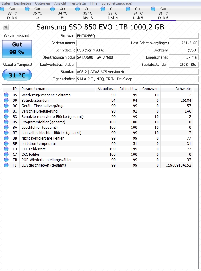 Die SSD wurde im August 2016 gekauft und kam als Systemlaufwerk in meinem per Veracrypt 1.23 vollverschlüsselten Officerechner zum Einsatz. Veracrypt soll zwar TRIM unterstützen, dennoch habe ich ca. 15% unpartitioniert und unverschlüsselt gelassen.