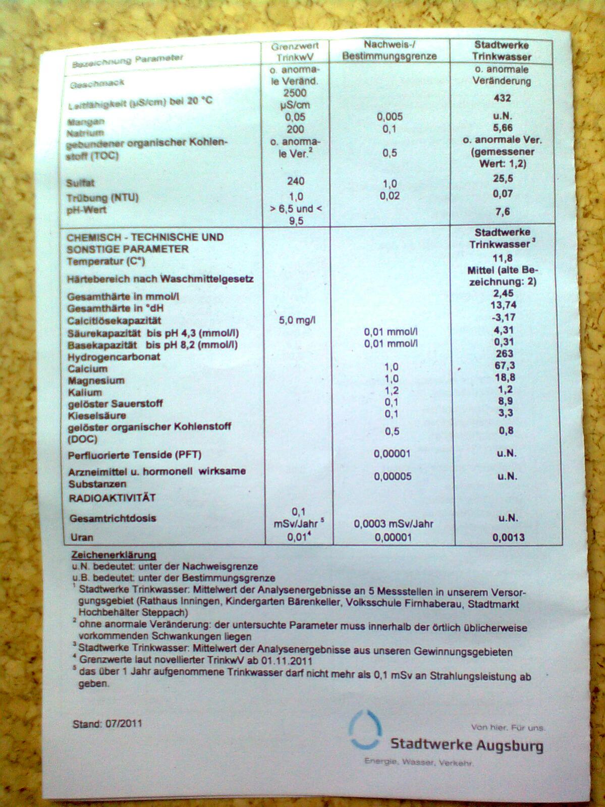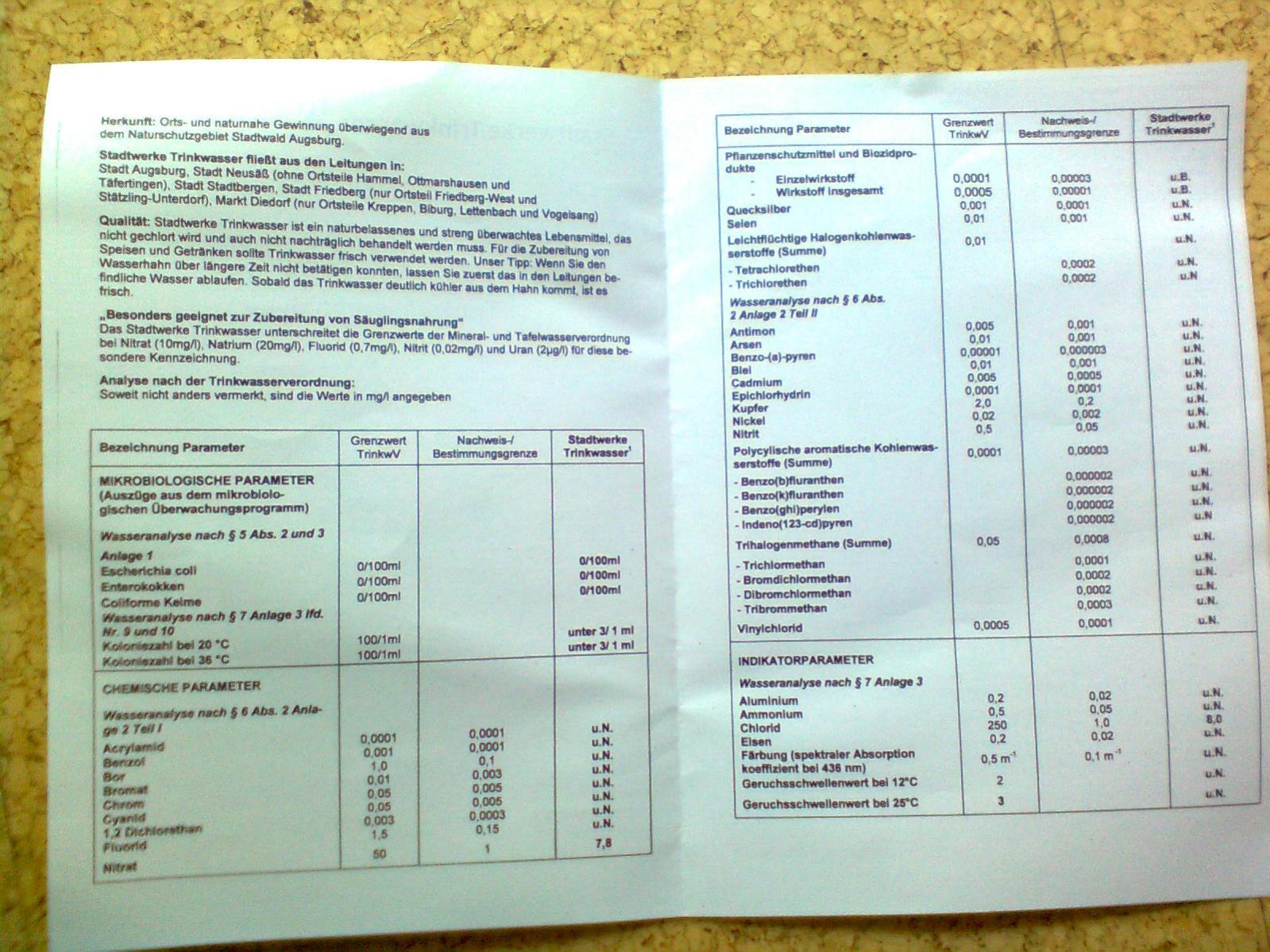 Die Grenzwerte sind in Deutschland so festgelegt, dass man davon nicht krank wird, auch wenn man ein Menschenleben lang nichts anderes trinkt! Versucht das mal mit Cola... Im Übrigen ist (abgekochtes) Trinkwasser auch unproblematisch für Neugebohrene, bei Mineralwasser ist das nicht unbedingt der Fall. Sollte es Probleme geben wird einem das aber auf jedem Fall mitgeteilt. Ansonsten gibts die Infos beim örtlichen Wasserversorger. Das ganze sieht dann so aus wie im Anhang (u.N. steht für "unter Nachweißgrenze").