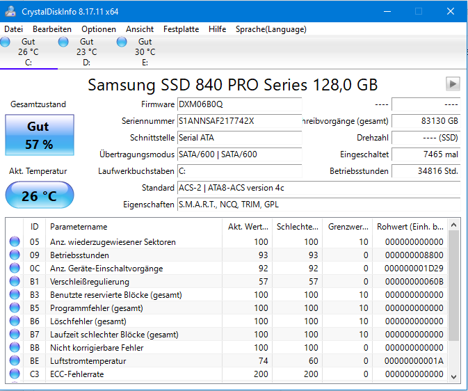 Hier mal für dich meine seit ca 8 jahren im System (alles drum herum hat schon mehrmals gewechselt) befindliche Samsung 840 (zugegebenermaßen die Pro), so als Einordnung:
