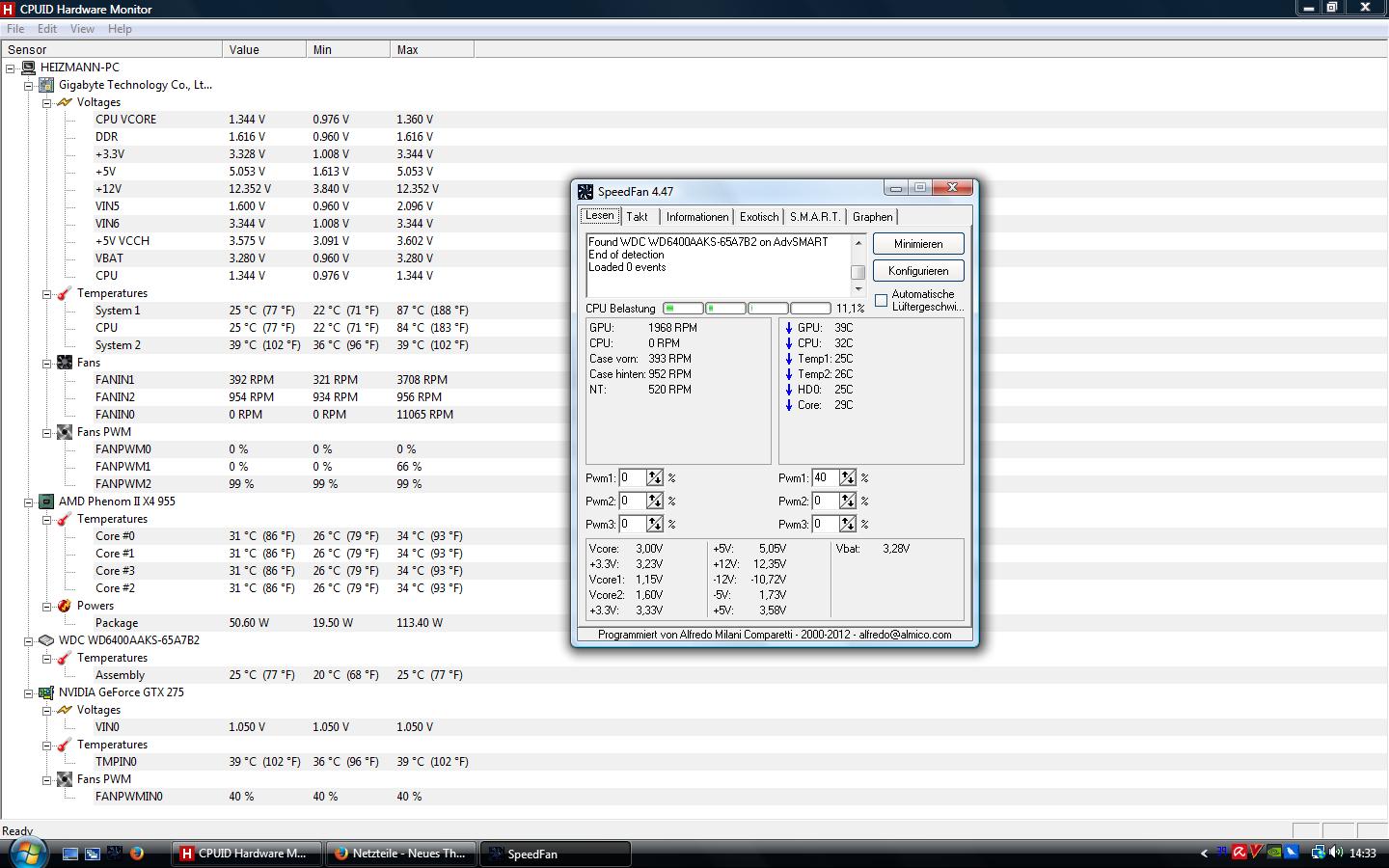 Nach intensivem Googeln ist die Fehlerursache bei meiner Fehlerbeschreibung offenbar häufig ein defektes Netzteil. Ich hab mit HWMonitor und Speedfan mal ein paar Werte auslesen lassen, vielleicht werdet ihr ja schlau daraus. Gerade die Spannungen sehen für mich teilweise komisch aus, oder?