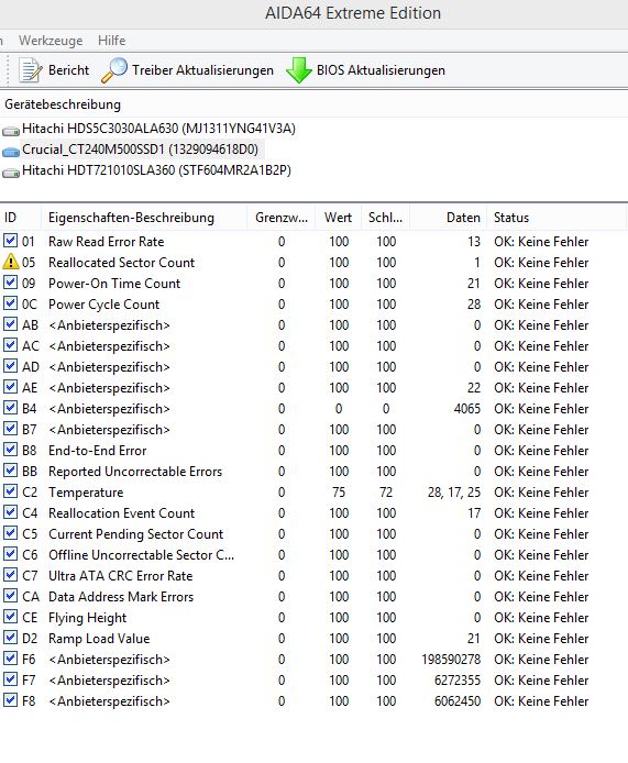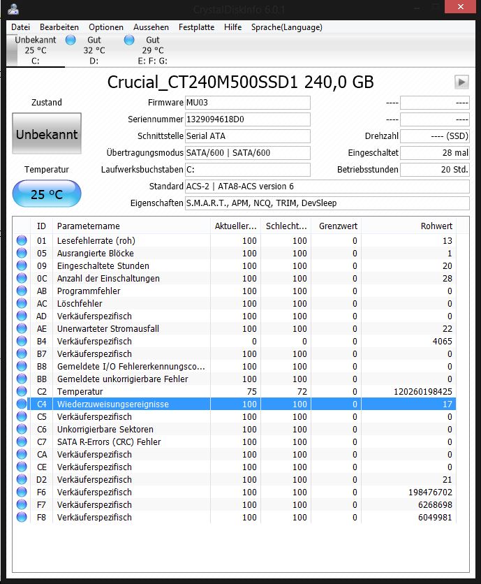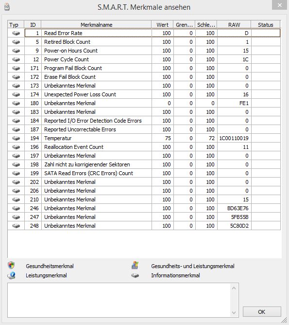 Ich hatte gestern meine neue Crucial M500 240 GB eingebaut und als Bootplatte installiert. Windows 8.1. In den Programmen, die ich nutze, um Status, Health usw. auszulesen, CrystalDiskInfo und SSDlife Free, war auch alles im grünen Bereich. Bis ich dann die neue Firmware der Platte, MU03, aufspielte. Ab diesem Zeitpunkt, zeigten mir die Programme Dinge an, die mir Sorgen machen. Nur in einem, HDdlife Pro, wird angezeigt, dass alles in Ordnung ist.
