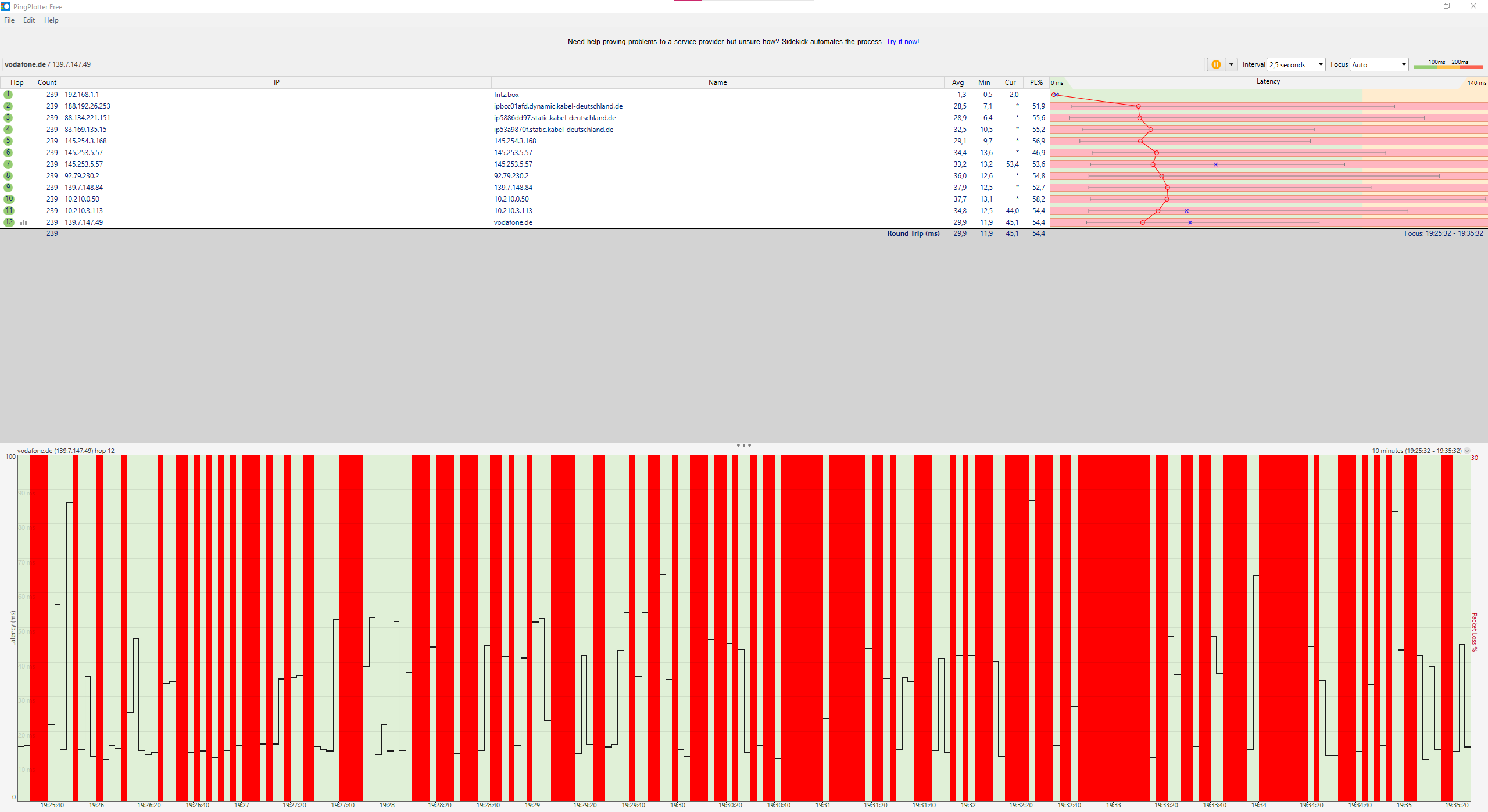 seit 14-16-18 Tagen bestehen an unserem Vodafone-Kabelanschluss (CableMax 1000) Probleme, die sich derart äußern, dass etwa alle 30 Minuten (plus-minus ein paar Sekunden) eine Art Glückspiel startet. Wenn man gewinnt, erhält man weitere 30 Minuten sehr, sehr gutes Internet (= maximale Down- und Upload-Raten). Wenn man verliert, erhält man eine quasi tote Internetleitung (= Packet Loss, maximal eingebrochene Down- und Upload-Raten, rien ne va plus). An diesem Punkt muss die Fritz!Box 6591 neugestartet werden und das Spiel beginnt von vorne. Besonders auffällig: das Power Level des DOCSIS-3.1-Kanals im Upstream schwankt sehr stark von 38 - 51 dBmV, wobei die Datenraten ab 48 dBmV zu schwanken beginnen und die Leitung ab 49 dBmV tot ist.