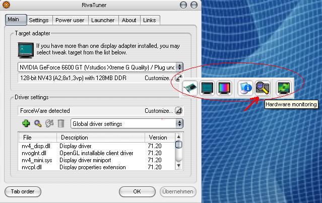 Zum überprüfen der Grafikkartentemperatur unter Volllast bietet sich der Rivatuner an, da dieser über einen Hardware Monitor verfügt.