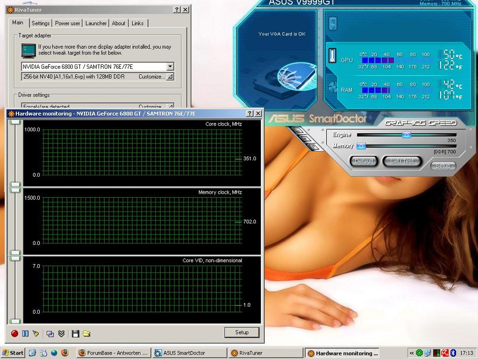 also wollte euch mal fragen ob meine Grafikkartentemperatur ok ist bei Idle 37°Grad und unter vollast 38-39! Grad? wenn ich es mit den anderen so vergleiche kommt es mir sehr wenig vor könnte aber auch daran liegen weil ich eine ältere Karte hab ohne extra Stromzufuhr usw. aja die Karte ist eine MSI Ti4200-VTD8X 128 Mb das ist ein NV28 Chip