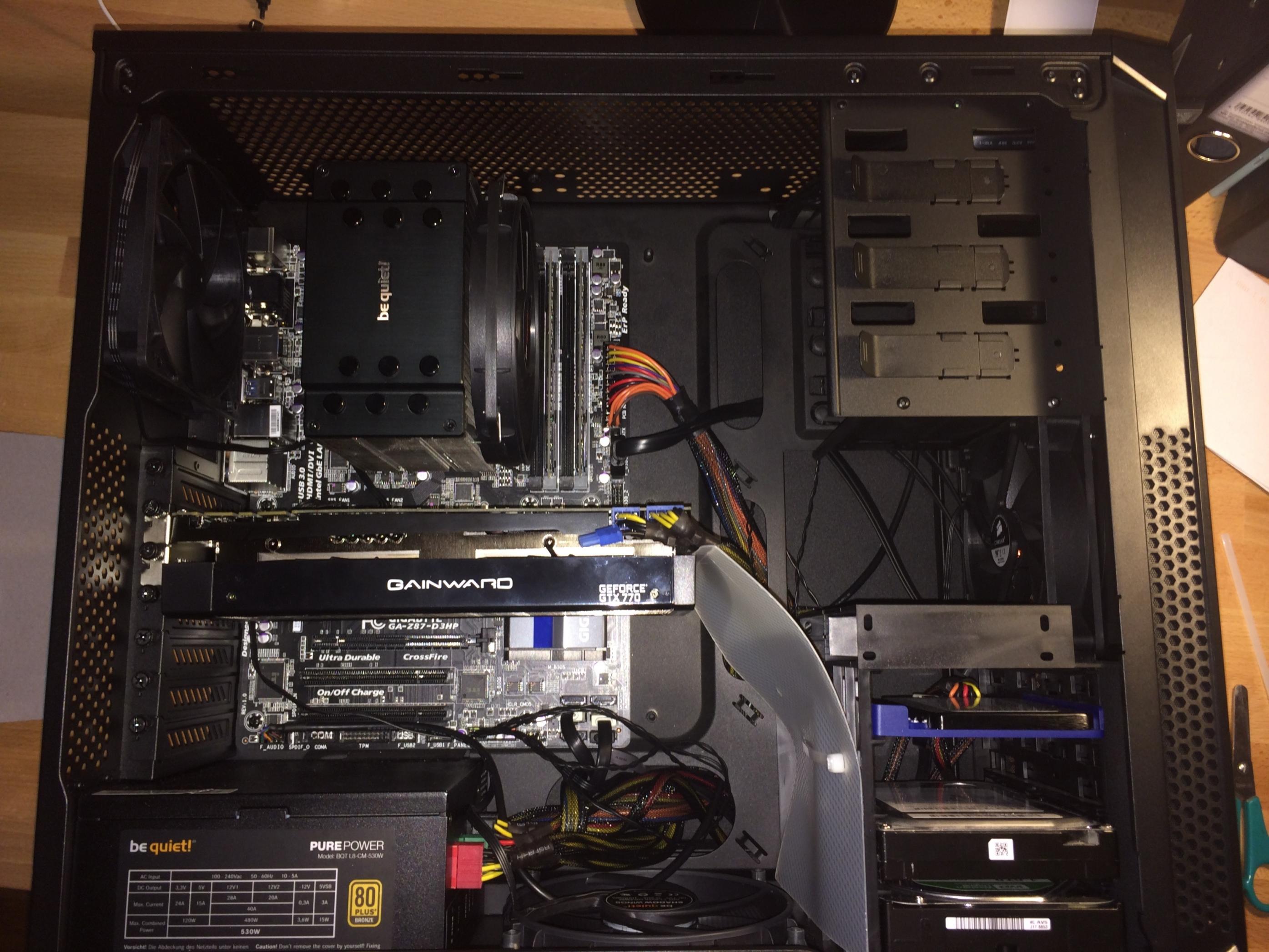 Nun habe ich einen weiteren 130mm im Boden angebracht und mittels einer Blende dafür gesorgt, dass sich der vertikale und der horizontale Luftstrom nicht kreuzen. Somit müsste die Grafikkarte (fast) die komplette Frischluft des unteren Lüfters abbekommen. Die Temperaturen konnte ich so zumindest auf 85°C in Battlefield 4 drücken . (Es sei dazu gesagt es handelt sich um eine Werksübertaktete 770 von Gainward.