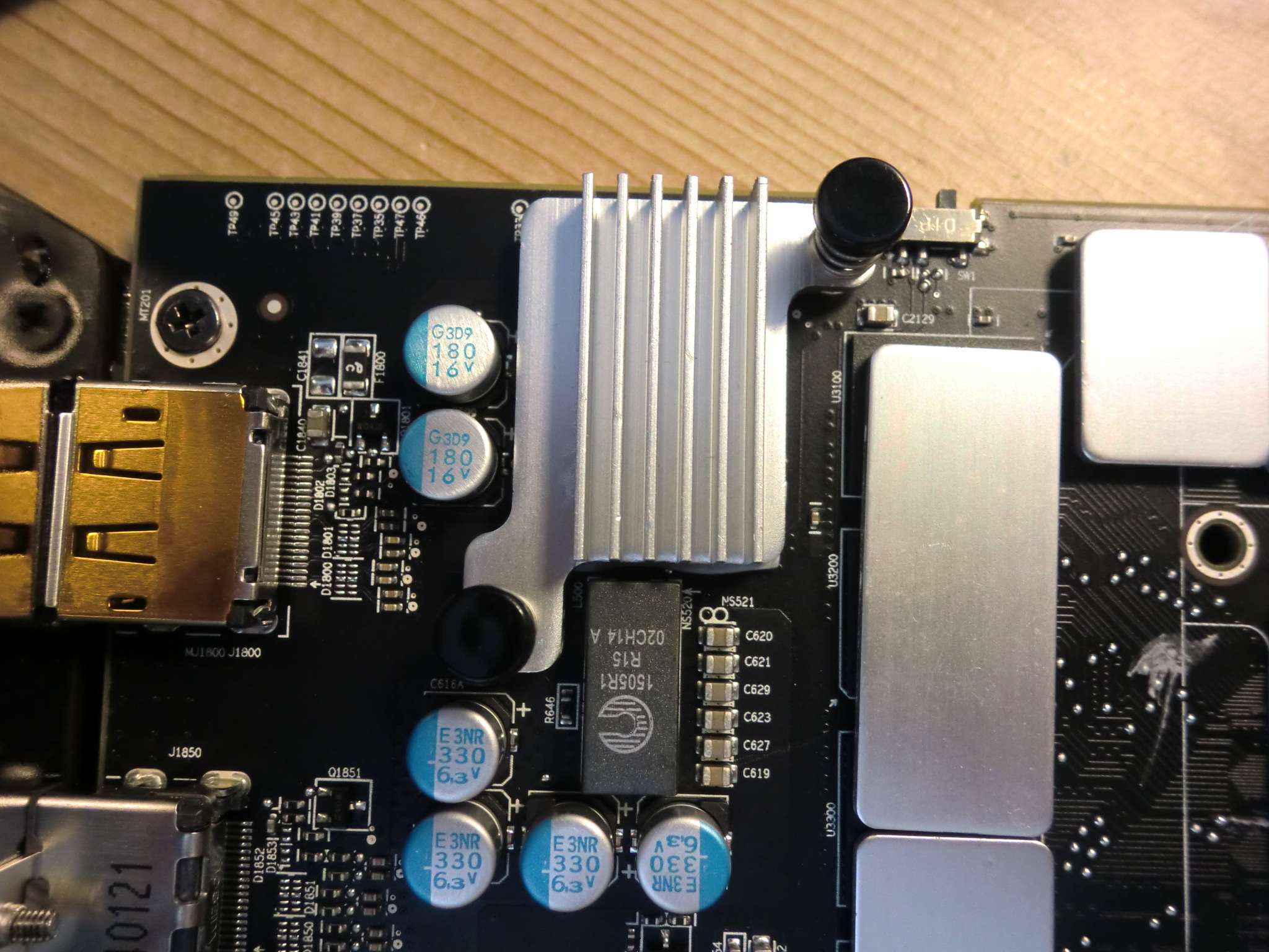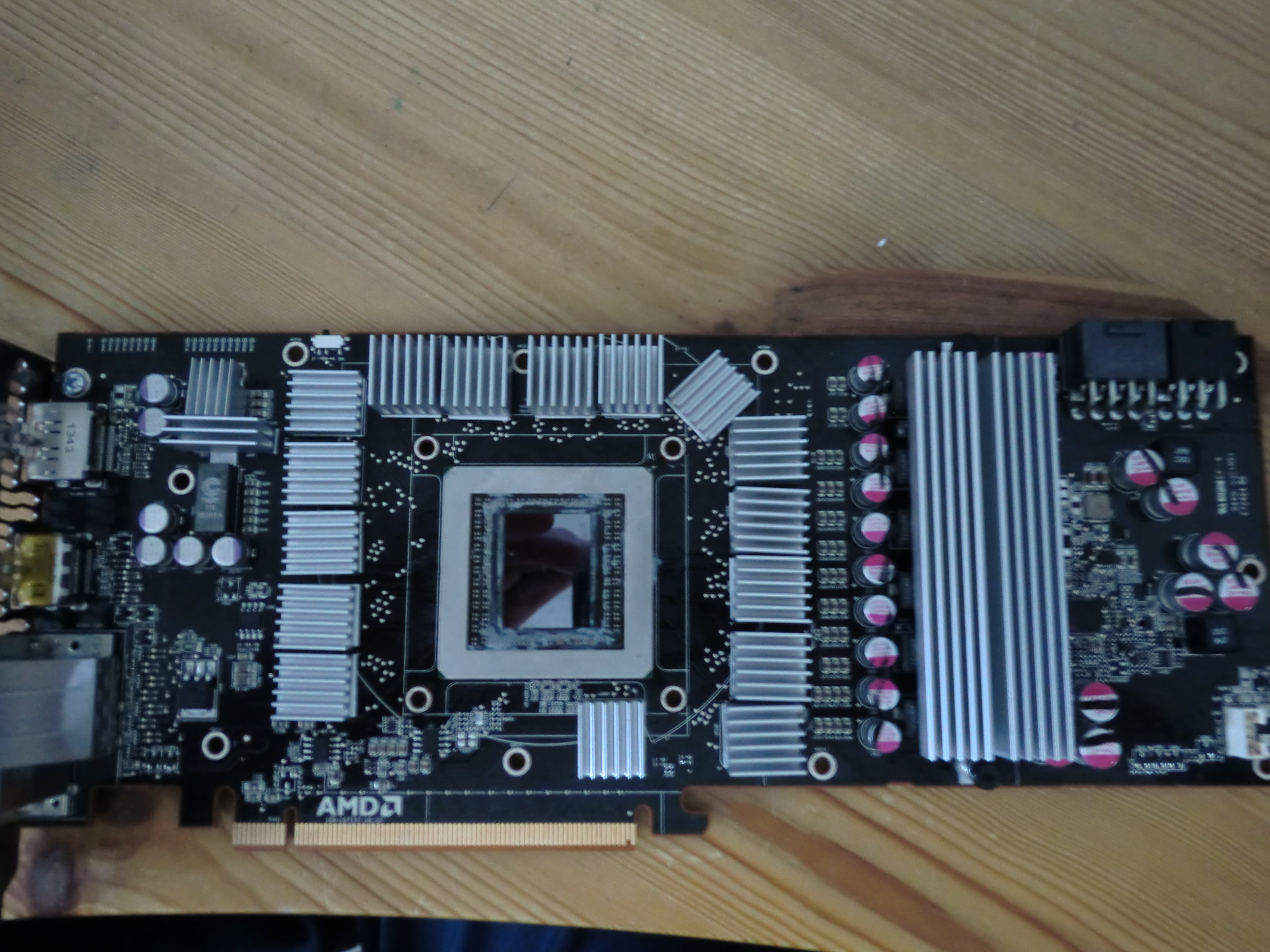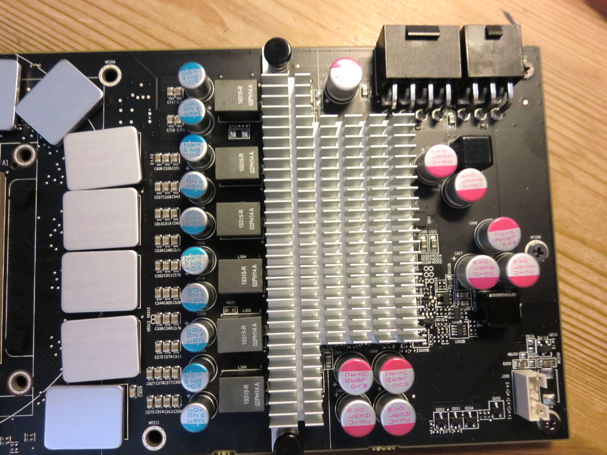 Habe die Karte vorhin umgebaut, schnell vier Kühlkörper auf die rechten RAMs geklebt (die Oberen haben schon einen Kühlkörper drauf). Hinten hat die Karte keine Speicherbausteine. VRMs habe ich jetzt aber komplett ausgelassen, muss ich mir Sorgen machen? Weiß jetzt auch so spontan nicht 100%ig welche Teile das genau sind, mag sich jemand die Mühe machen die auf dem Bild zu markieren?