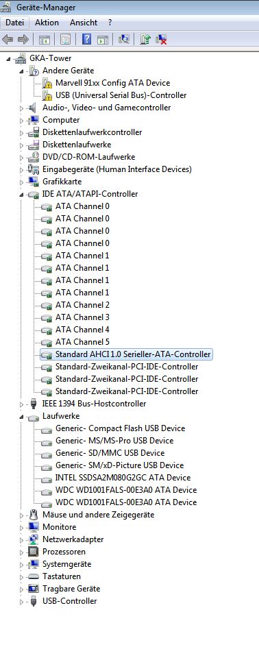 Eigentlich hatte ich zuesrt gedacht, dass ich die Umstellung auf AHCI durchgeführt hätte. Nun ist mir jedoch aufgefallen, dass man die GSATA Anschlüsse einzeln auf AHCI umstellen kann.