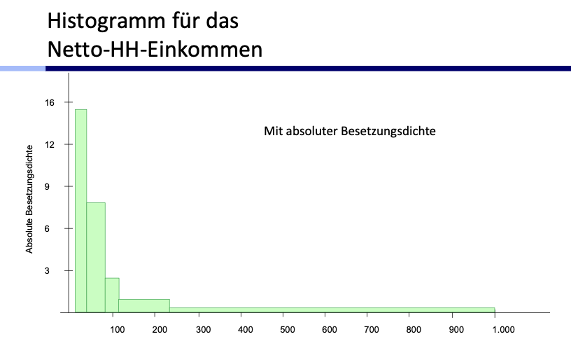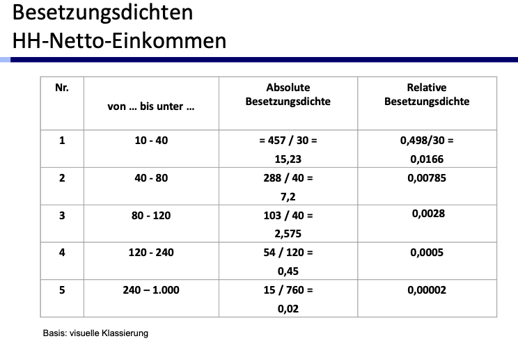 Nehme dazu bitte die formel die ich in meinem Statistik Kurs anwende um die , Dichte und die absolute Besetzungsdichten zu berechnenKlassenbreite : Klassenobergrenze - Klassenuntergrenze Absolute Besetzungsdichte : Häufigkeit/Breite, also Häufigkeit geteilt durch die Breite