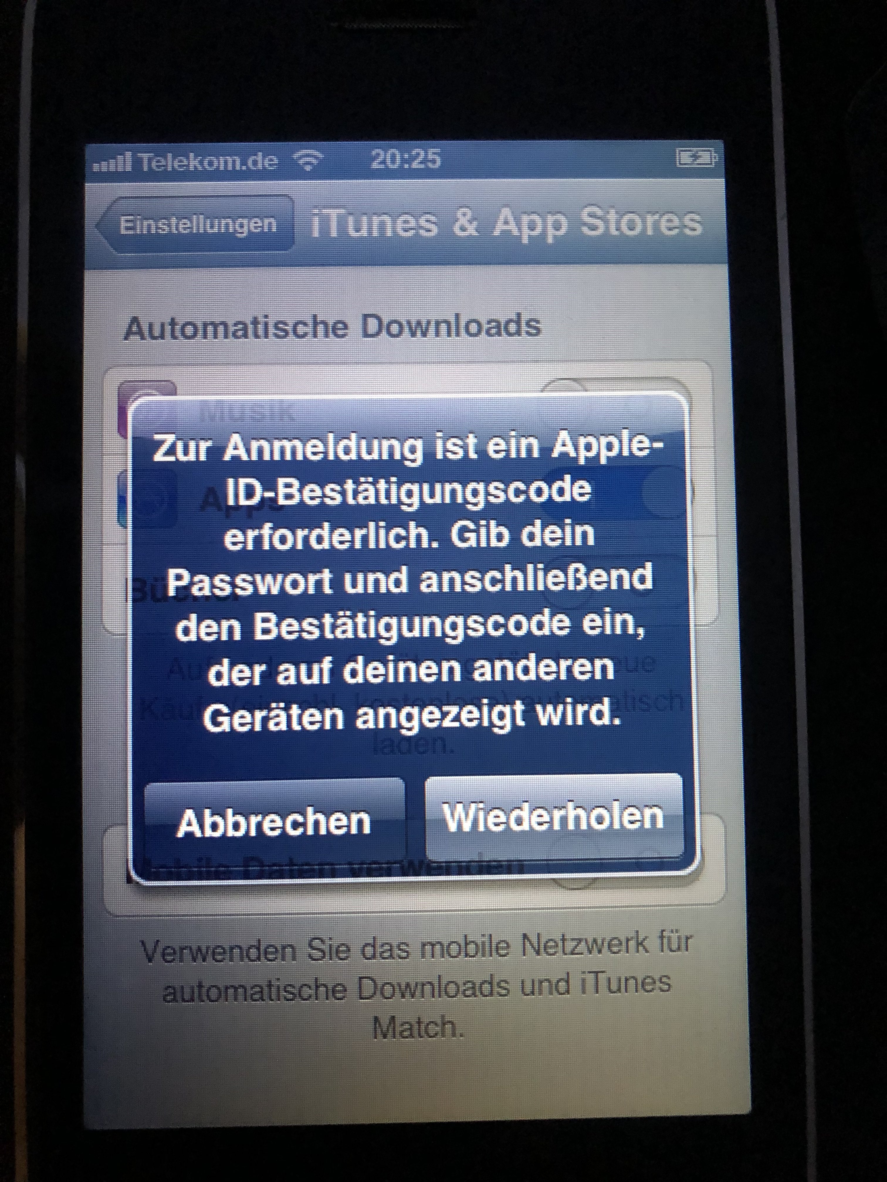 Direkt danach erscheint auf dem iPhone 8 zunächst der Hinweis, dass sich auf einem anderen Gerät versucht wird in meinen iTunes Account einzuloggen. Dies bestätige ich mit drücken auf Erlauben und bekomme den Code präsentiert. Nur: Wo gebe ich diesen Code auf dem 3GS ein? Denn dort erscheint nur dies hier: