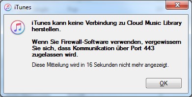 "iTunes kann keine Verbindung zu Cloud Music Libary herstellen, Prüfen sie Port 443 auf der Firewall"