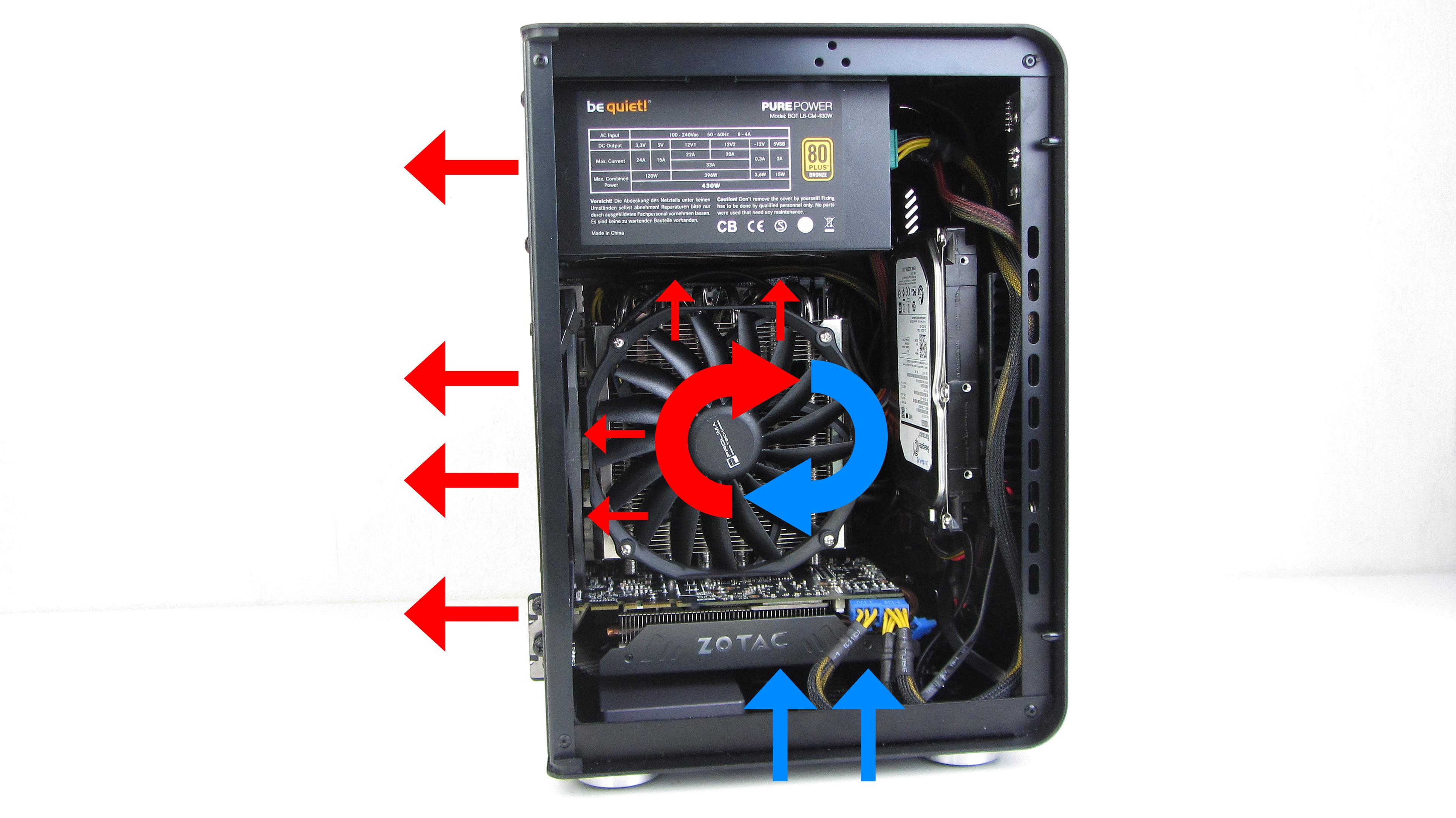 Ein minimaler Teil der Abwärme gelangt in Richtung des Netzteils und wird durch den Netzteillüfter ebenfalls nach außen befördert.