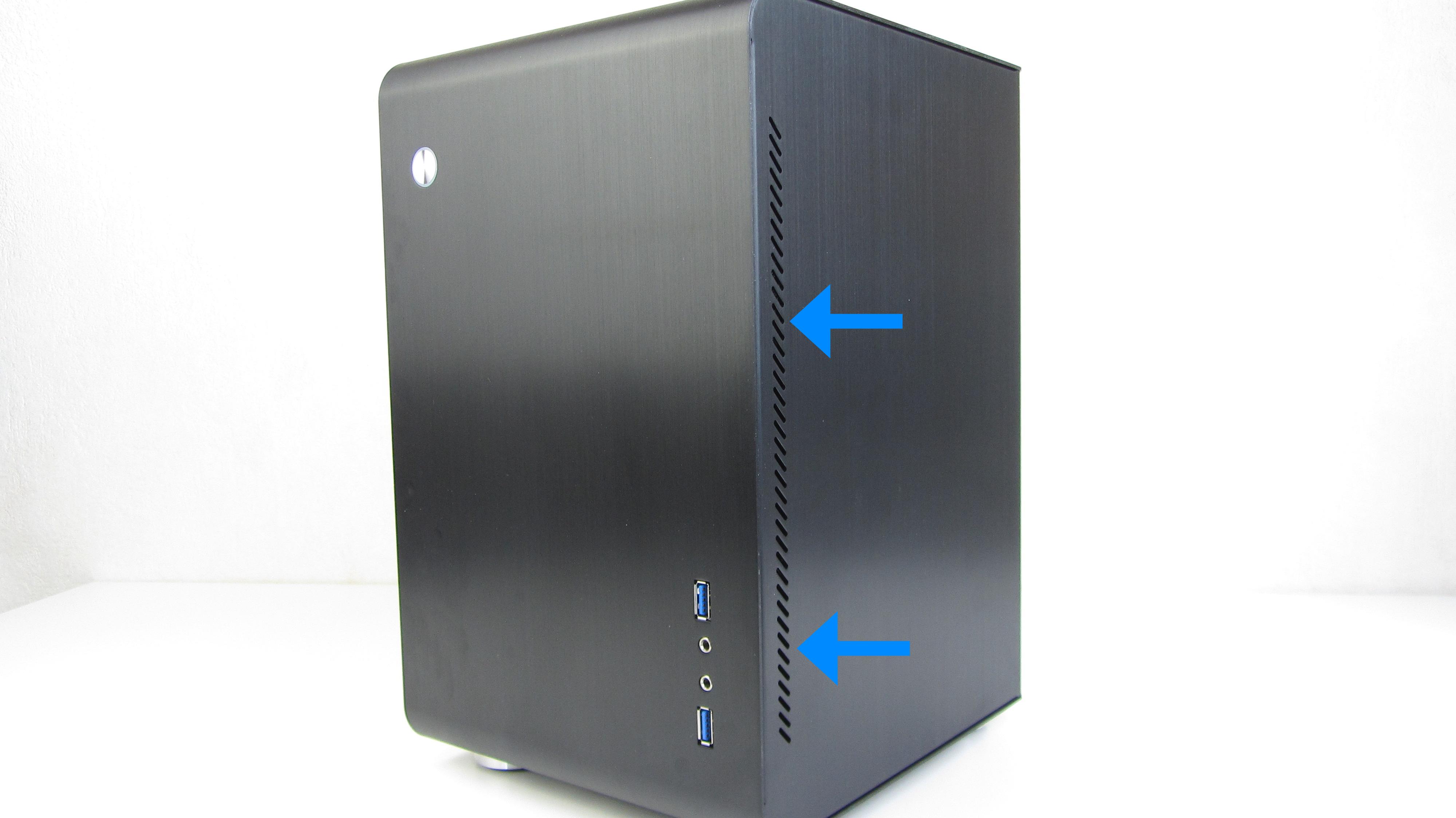 Der Airflow ist essenziell für die Kühlung besonders warmer Komponenten wie z.B. Prozessor und Grafikkarte. Obwohl in diesem Setup kein Lüfter vorhanden ist, dessen Aufgabe es ist kühle Luft in das Gehäuse zu befördern, sprechen die Temperaturwerte für sich. Nicht zuletzt durch die Lüftungslöcher im Gehäuse. So bezieht die Grafikkarte, kühle Luft von unten und das obwohl unten eine SSD verbaut ist.