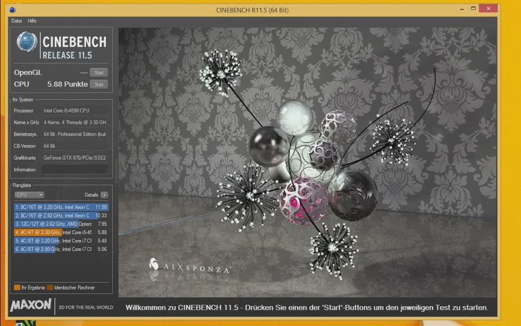 Der CPU Belastungstest, erfolgt mittels Cinebench 11.5. Dieser Test nutzt sämtliche Fähigkeiten des Prozessors, um eine fotorealistische Szene zu berechnen. Dabei wird die CPU nicht wärmer als 48 °C.