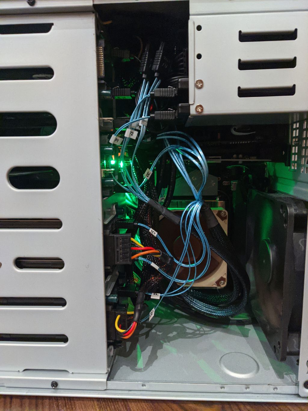 - diese blauen dünnen Server-SATA-Kabel sind ein Segen für schmale Gehäuse und im Bunch auch sehr günstig zu besorgen