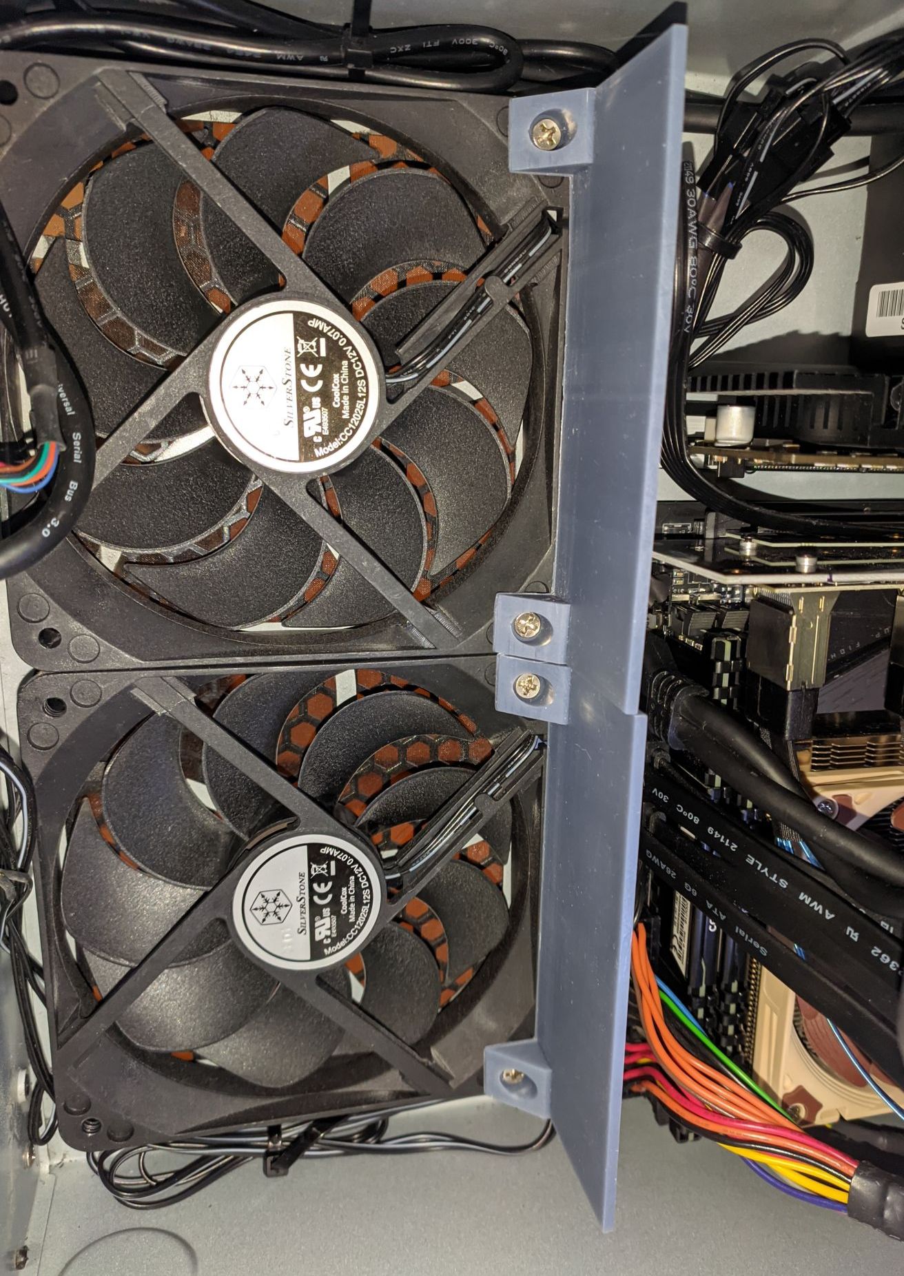 Ebenfalls haben viele User mit dem Gehäuse die Erfahrung gemacht, dass die HDDs im Dauerbetrieb und vor allem unter Last zu warm werden. Dem kann man ein wenig Abhilfe per 3D Print Blockaden schaffen, die den Luftstrom der seitlichen Gehäuselüfter etwas mehr durch die HDDs im Käfig forcieren, indem sie recht bündig zu dem HDD Käfig abschließen. Angedeutet rechts im Bild sieht man nun auch den M.2 zu SATA Adapter und die verbaute Radeon GPU. Es wurde eng.